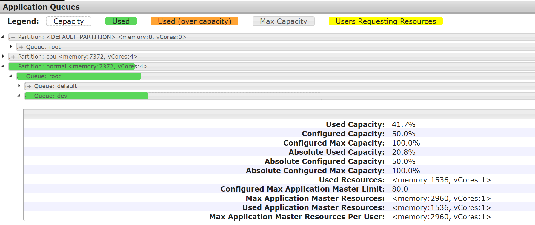 yarn.scheduler.capacity. <queue-path>.capacity | 设置队列可以访问属于 DEFAULT 分区的节点的百分比。每个 parent 队列下直接子队列的 DEFAULT 容量总和必须等于100。 |