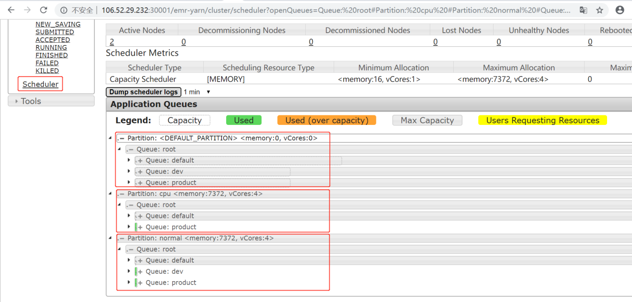 yarn.scheduler.capacity. <queue-path>.accessible-node-labels.<label>.maximum-capacity | 与 Capacity Scheduler 配置项 yarn.scheduler.capacity. <queue-path>.maximum-capacity 类似,它指定了<queue-path>在<label>分区的最大容量,默认为100。 |