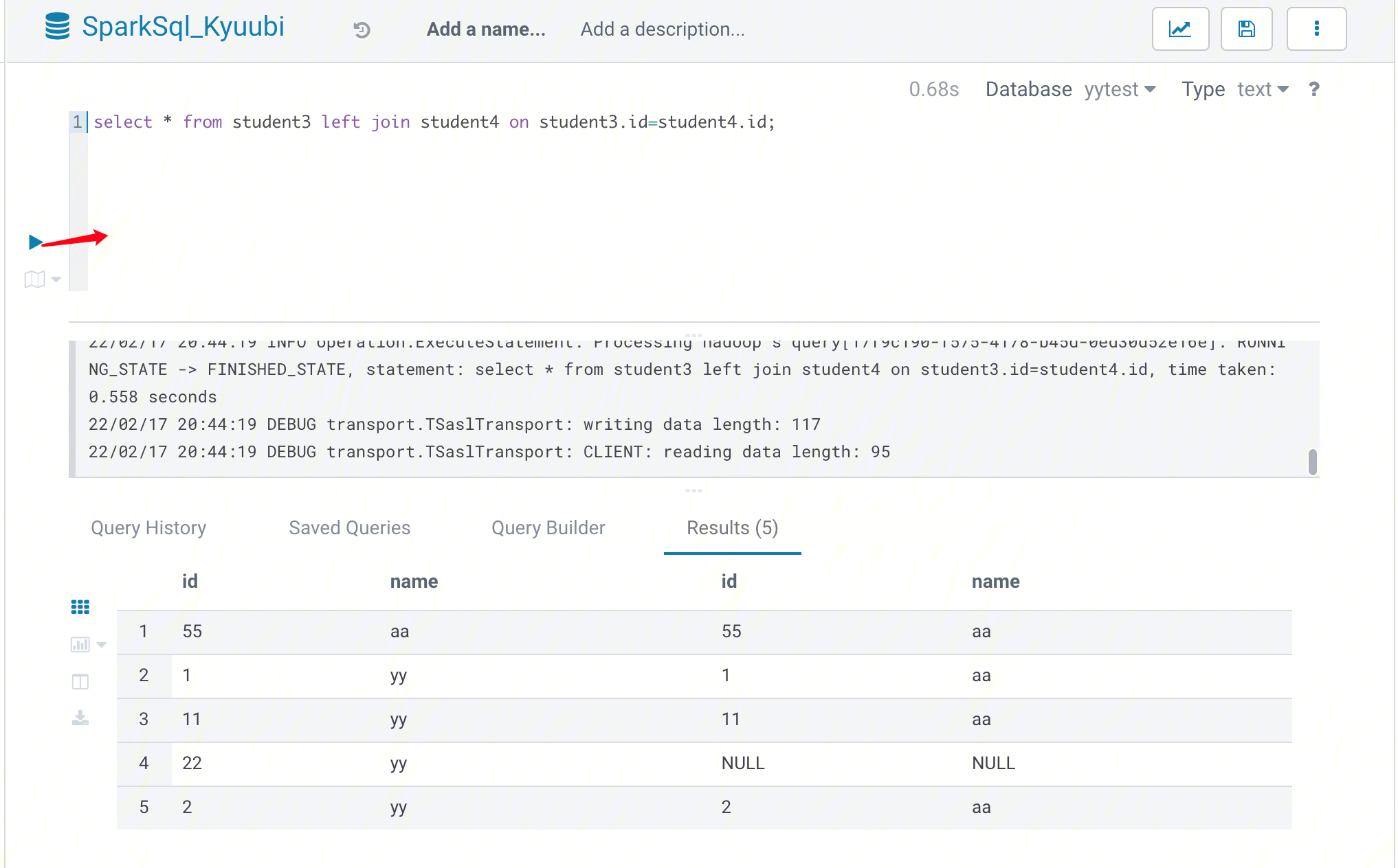 Create table success!Running: show tables 'KyuubiTestByJava'defaultRunning: describe KyuubiTestByJavakey intvalue stringRunning: select * from KyuubiTestByJava42 hello48 worldRunning: select count(1) from KyuubiTestByJava2