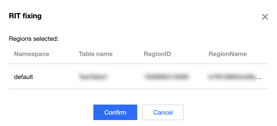 3. 单击列表操作中修复,或者勾选需要修复的 Region 后单击批量修复,在RIT修复弹框页,确认相关信息。