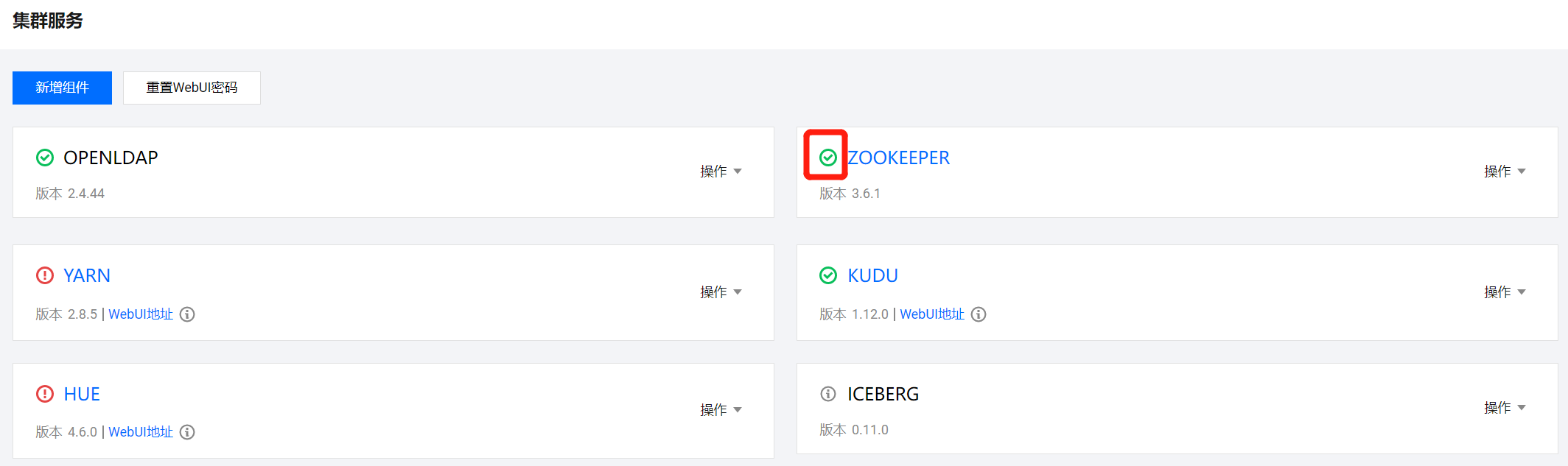 灰色:未知或未探测 | 服务健康状态未知或未探测。无进程组件无健康状态为未探测,有进程组件如进入维护模式或操作状态已停止为未探测;有进程组件如无法正确获取角色实例健康状态信息为未知。如排查业务无问题,无需关注。 | 1. 该组件全部角色实例健康状态非存在隐患或不可用的角色,且至少有一个角色实例健康状态为未知。例如,HDFS 有1个 NameNode 角色实例和2个 DataNode 角色实例,其中1个 DataNode 角色实例健康状态为未知,另1个 DataNode 角色实例和 NameNode 角色实例健康状态为良好,HDFS 健康状态为未知; 2. 该服务全部角色实例健康状态为未探测。当服务全部角色实例进入维护模式或操作状态已停止时,其健康状态不做探测。 3. 该组件无进程,则其健康状态不做探测,如 Iceberg、Hudi、Flink 等。 |