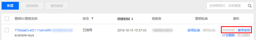 找到您需要更改状态的密钥,在其密钥信息的右侧操作区域,可以对该密钥进行启用、禁用操作。