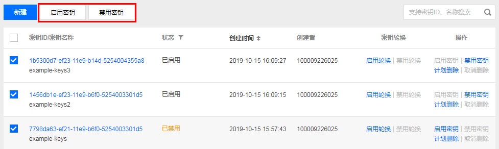 勾选多个您需要更改状态的密钥。