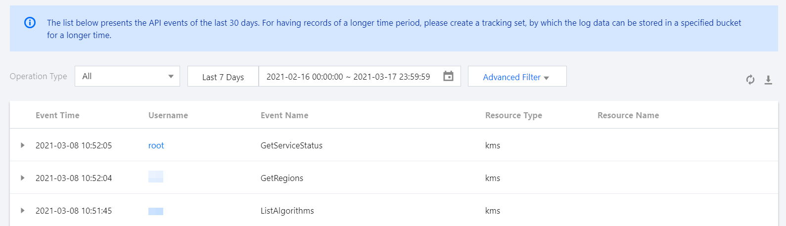 在操作记录页面中,您可以根据用户名、资源类型、资源名称、事件源、事件 ID 、关键词或对应操作事件时间,获取相关的操作记录信息,默认情况下只展示部分数据。