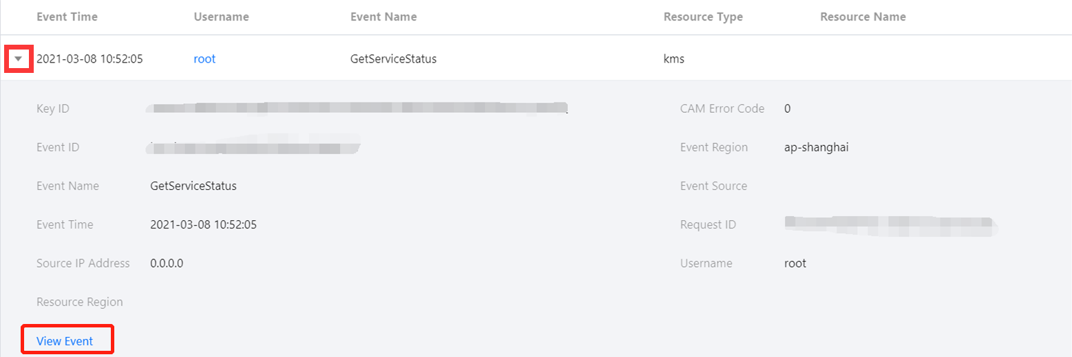 获取相关操作记录列表后,可以单击该操作记录左侧的展开按钮,可查看此操作记录的详情,包括事件时间、用户名、事件名称、访问密钥、事件 ID 等信息,单击
