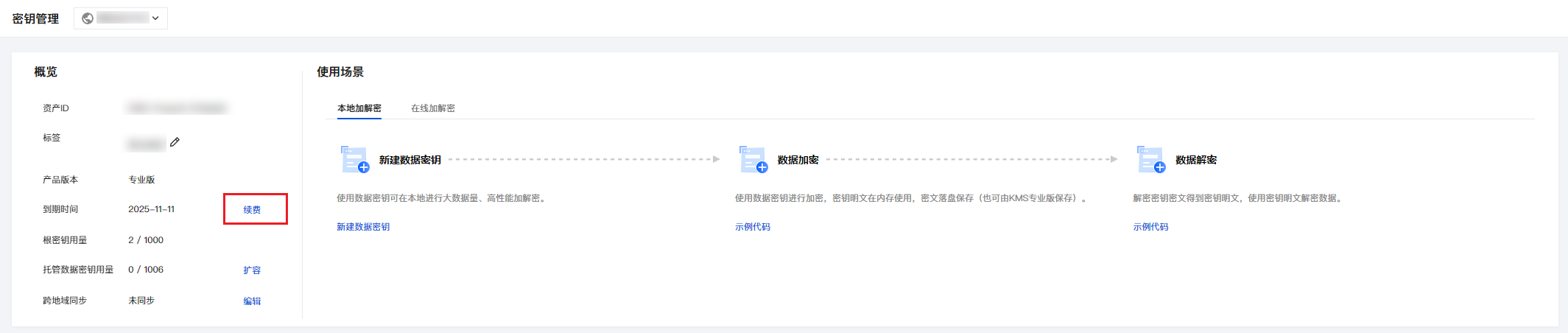 3. 在密钥管理页面,将显示您当前的密钥管理系统版本、到期时间及使用情况等信息。单击续费可进行手动续费操作。