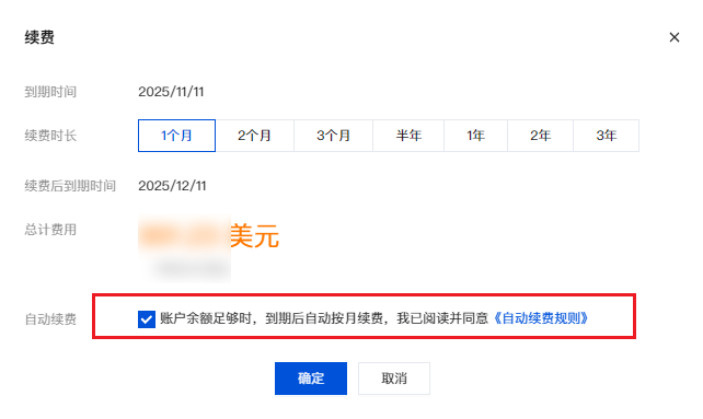 4. 在续费弹窗中勾选“自动续费”,单击确定完成相关支付流程,即开通自动续费。