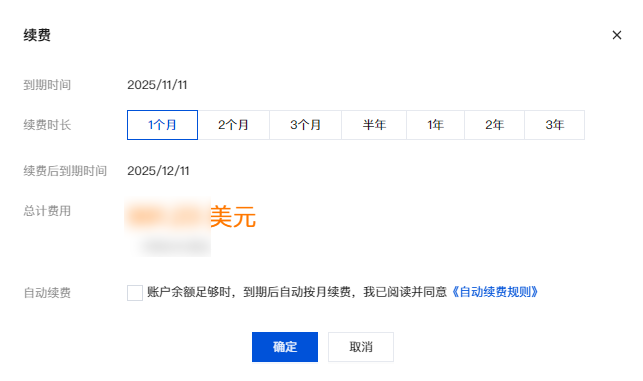 4. 在续费弹窗中选择“续费时长”,单击确定完成相关支付流程,即完成续费。