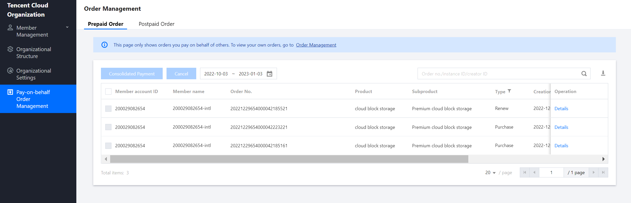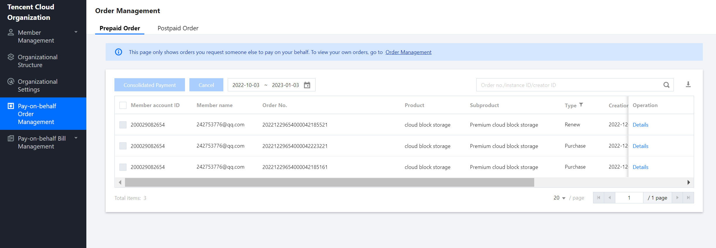 管理账号可以查看成员账号的代付订单,针对待支付订单可以代付或取消。如下图所示: