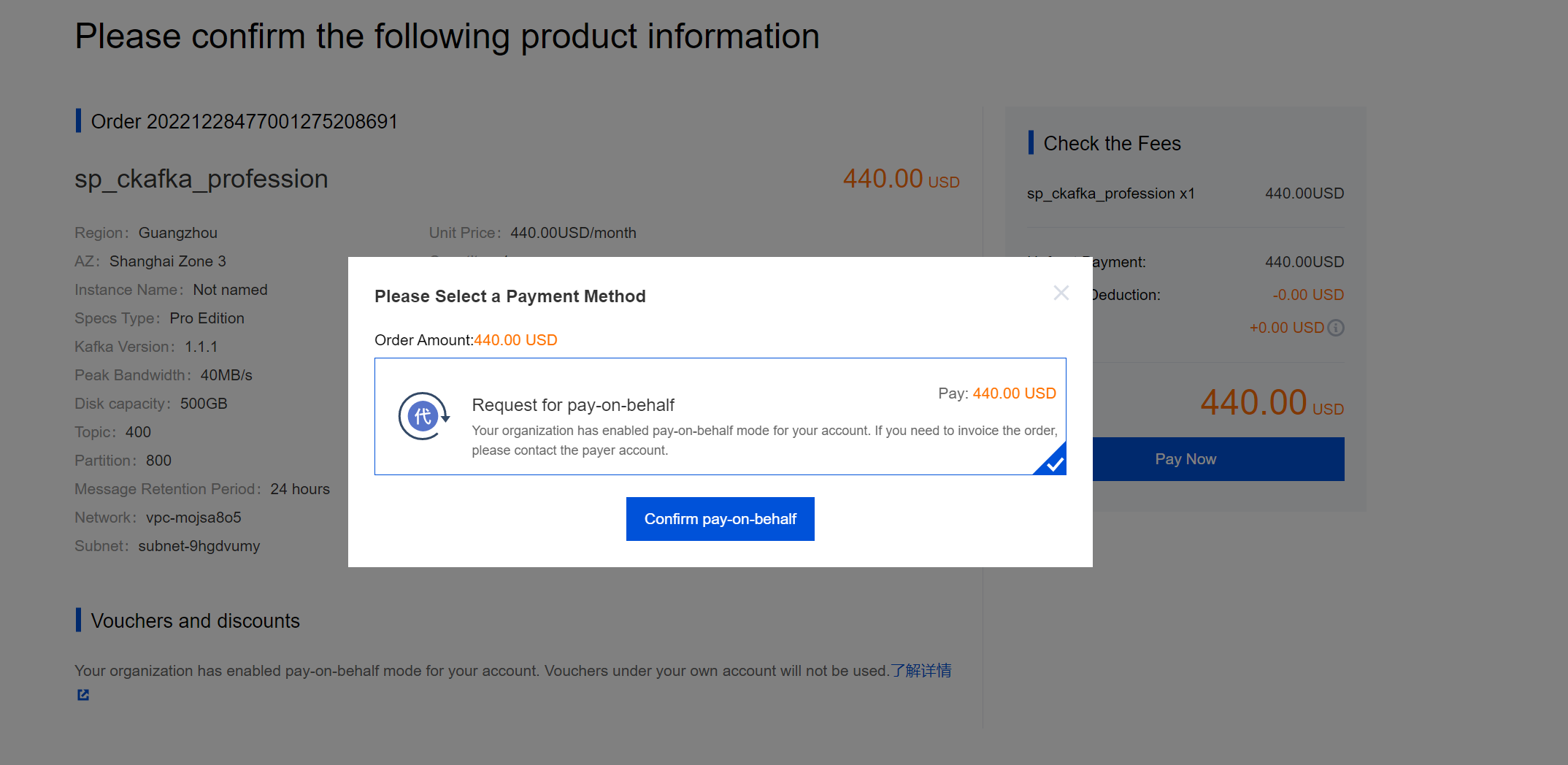 成员账号进行预付费新购/升配时,只能选择申请代付者账号支付,不需要余额支付或在线支付。选择申请代付者账号支付后,不需要代付账号人工操作,系统会参考代付账号的余额、信用额度情况,进行自动代付并展示代付结果。成员账号提交订单后,选择申请代付者账号支付后单击确认申请代付即可。如下图所示: