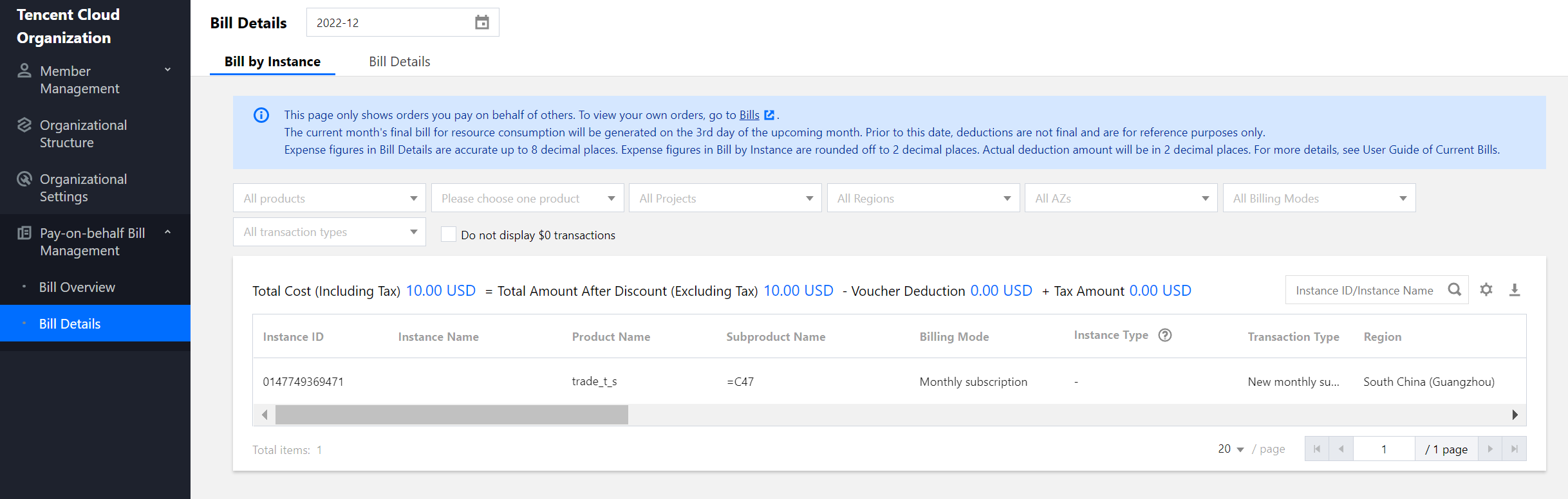 成员账号的账单自动结算至代付账号,由代付账号统一管理。代付账号可以查看名下所有成员账号的账单。被代付的成员账号可查看自身相关的代付账单,不可查看其他成员账单。