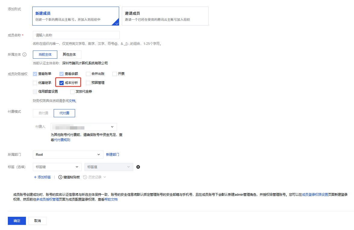 3. 在添加成员页面中,选择新建成员,勾选成本分析,单击确定。如下图所示: