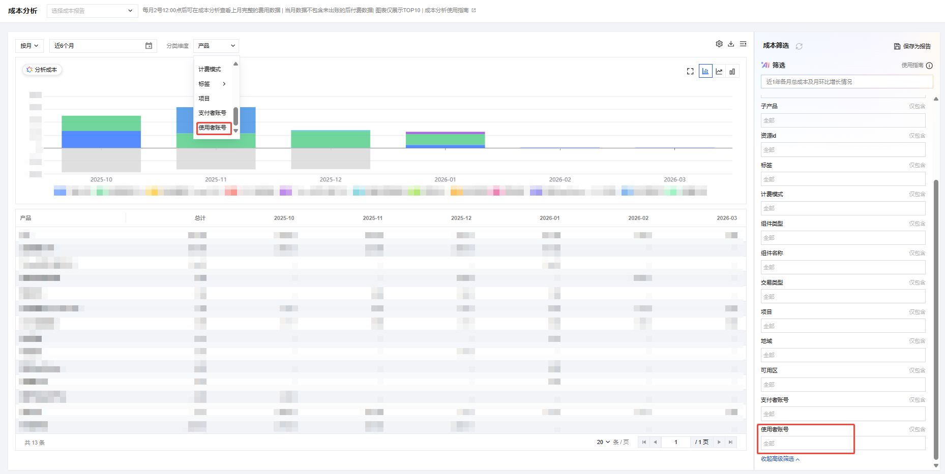 可通过分类维度筛选使用者账号后查看成员的成本分析数据;