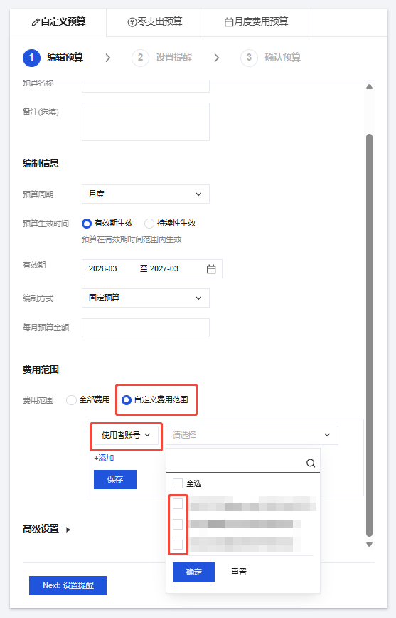 4. 在预算管理页,单击新建预算,按页面提示填写相应信息,费用范围 > 自定义费用范围 > 使用者账号,筛选成员账号,为成员账号配置预算。