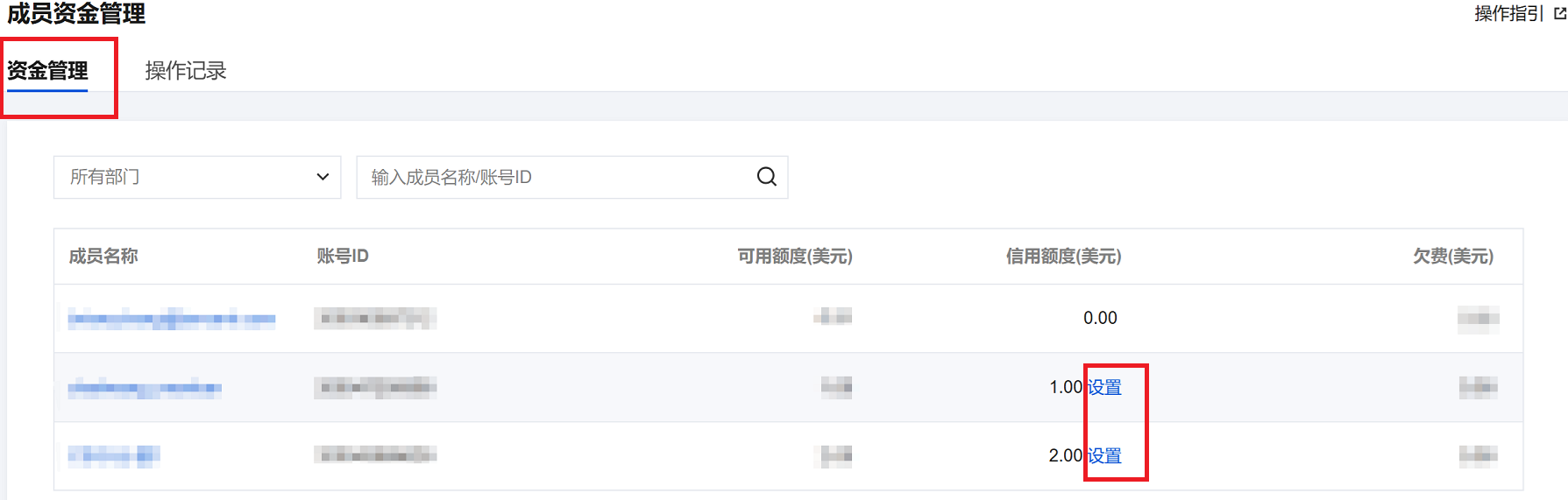1. 登录集团账号管理控制台,选择左侧导航栏中的成员资金管理。 2. 在资金管理页面,可以查看成员账号的信用额度,单击设置。