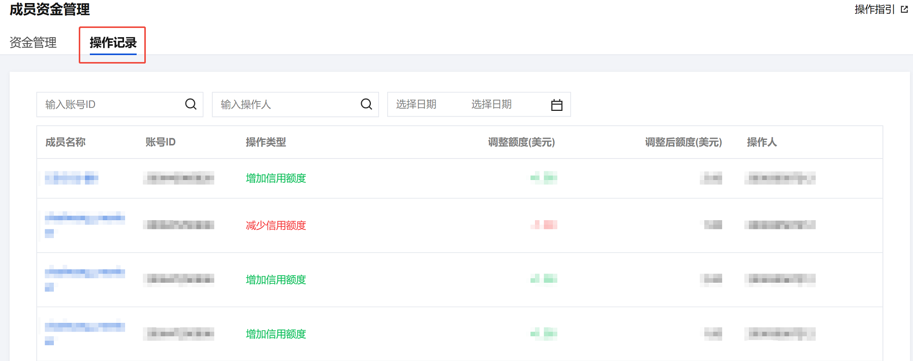 在 成员资金管理 页面,单击操作记录页签,即可查看管理账号对成员账号信用额度的历史操作记录。