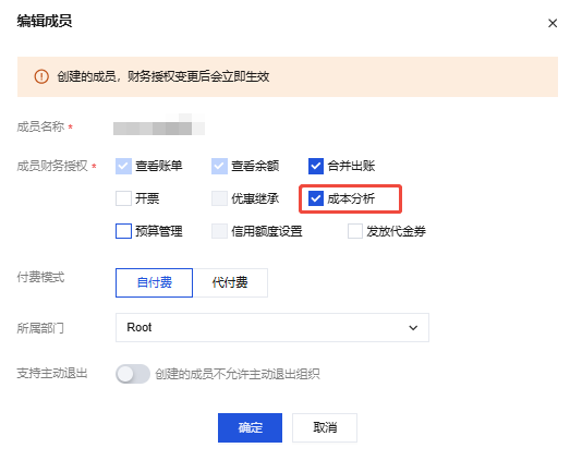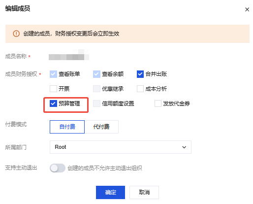 5. 在编辑成员页面,勾选预算管理后单击确定。更多介绍请参见 预算管理。 查看预算管理