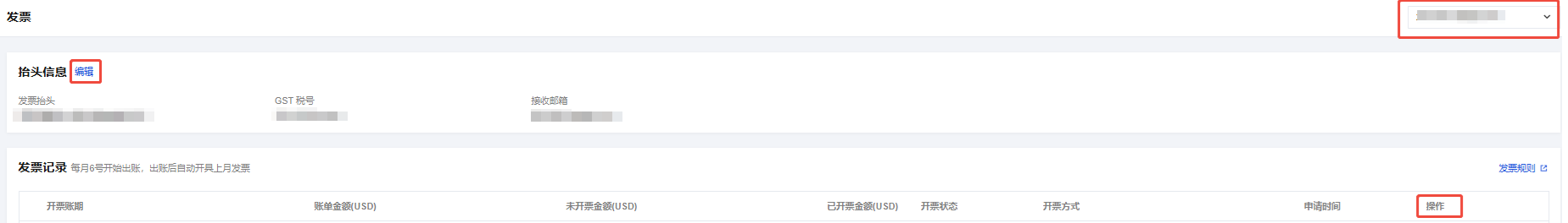 1. 管理账号登录费用中心控制台,选择左侧导航栏中的 发票。 2. 通过右上方的下拉列表,选择对应的成员账号,为对应的成员账号开票。开具的发票归属于成员账号。