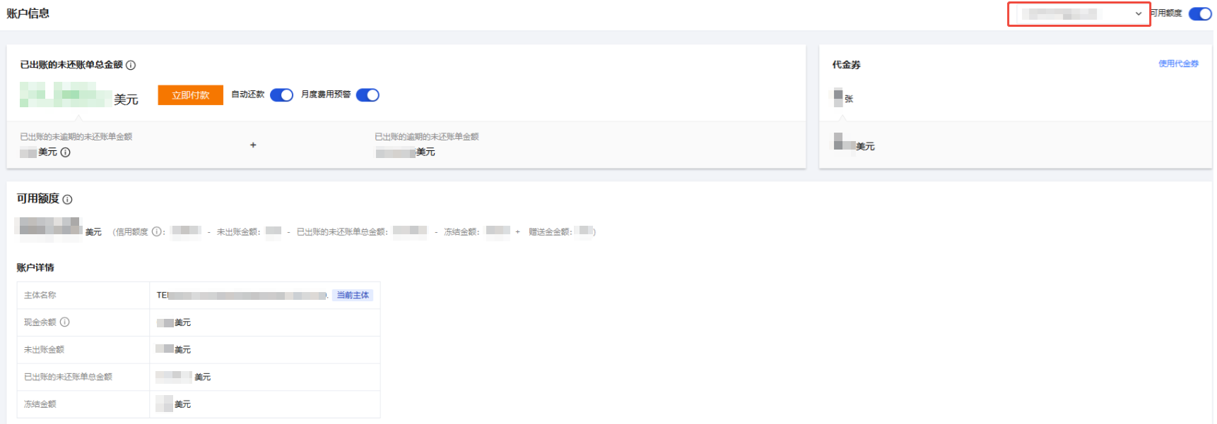 1. 管理账号登录费用中心控制台,选择左侧导航栏中的 账户信息。 2. 通过右上方的下拉列表,选择对应的成员账号,查看成员账号的账户余额信息。