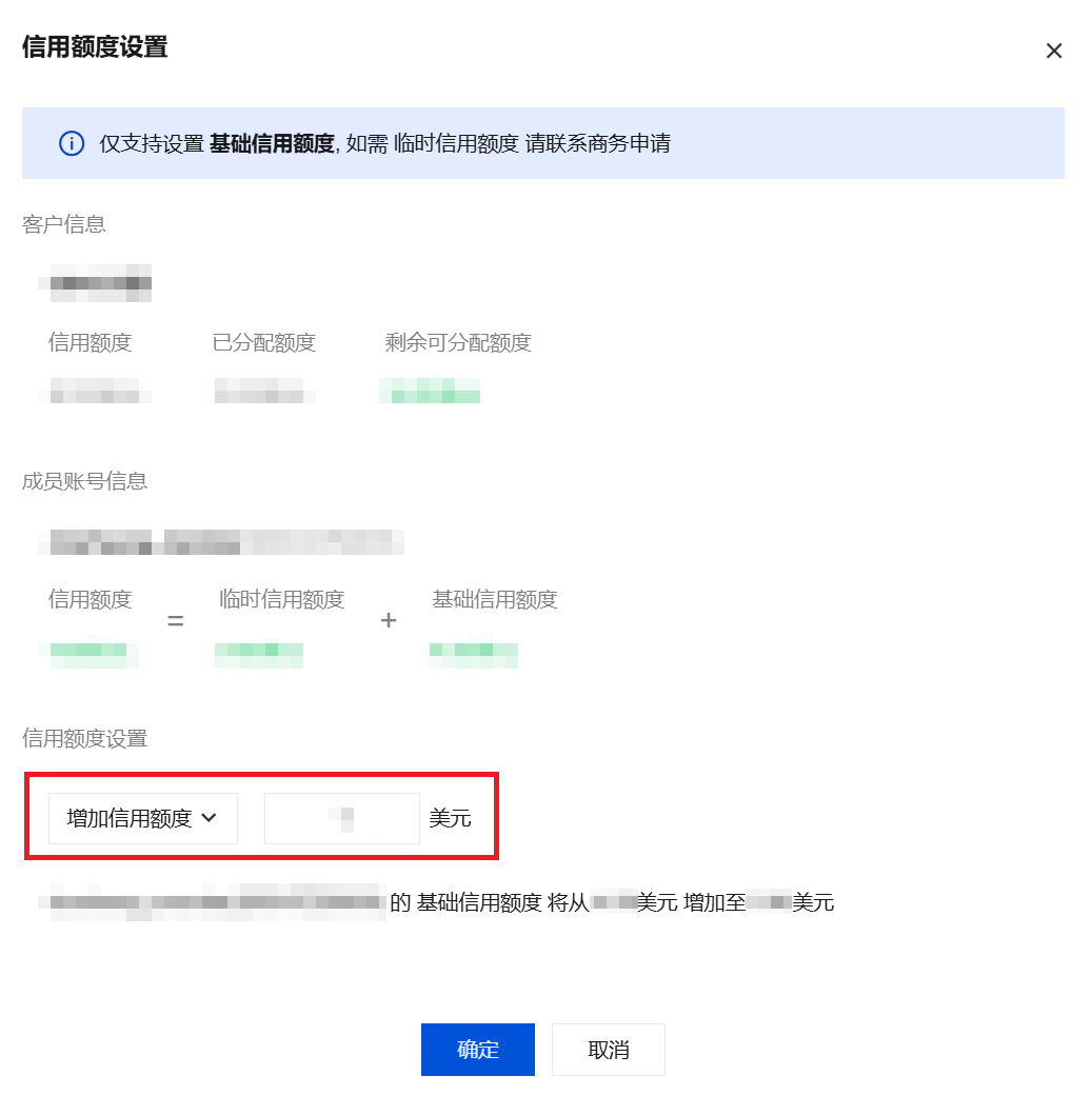 3. 在信用额度设置弹窗中,输入需要增加或减少的信用额度,并单击确定,如下图所示: