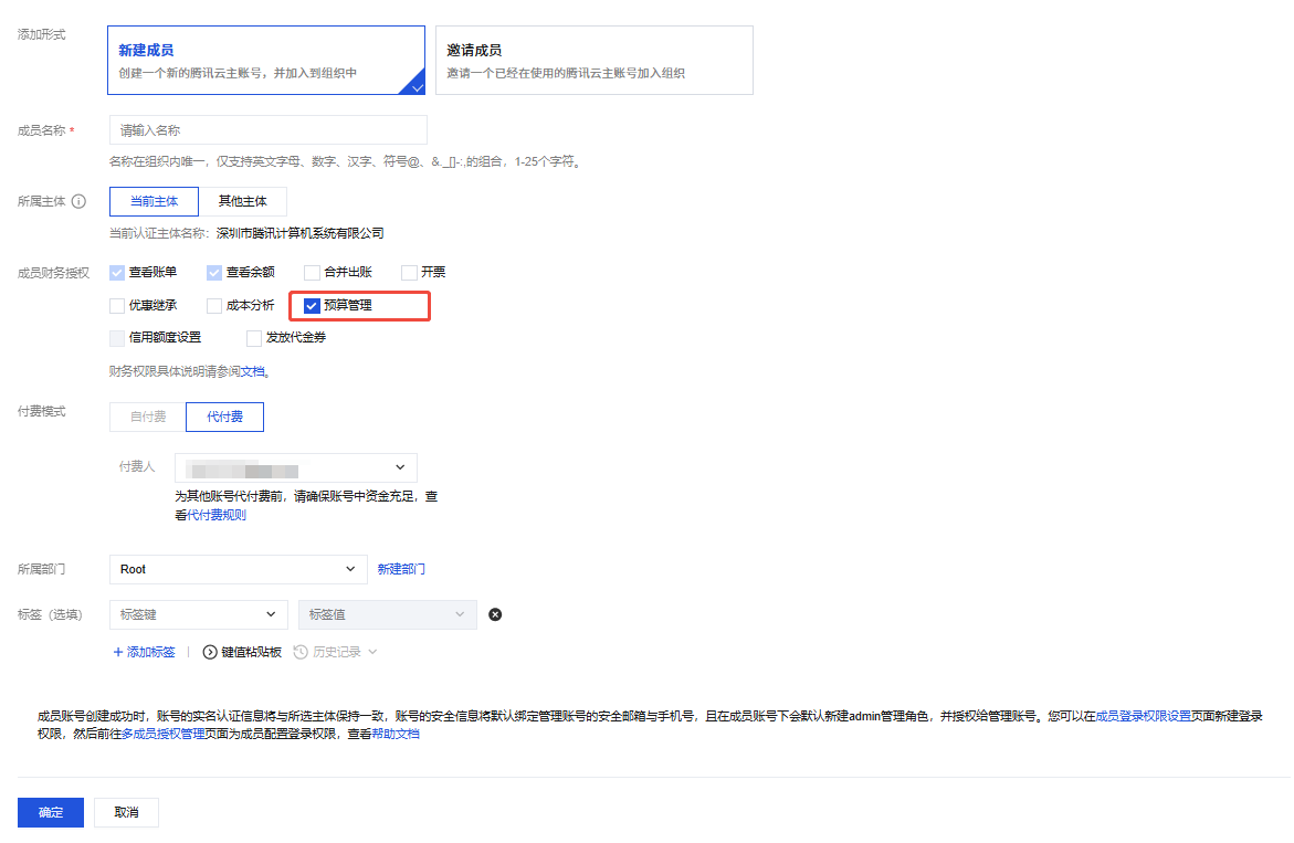 3. 在添加成员页面中,选择新建成员,勾选预算管理,单击确定。如下图所示: