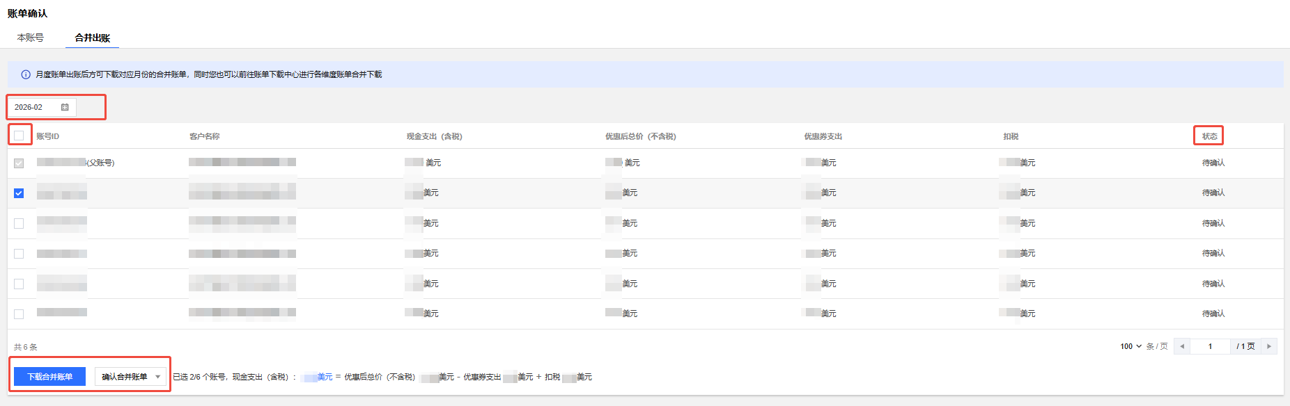 1. 管理账号登录费用中心控制台,选择左侧导航栏中的 账单确认。 2. 选择合并出账页签,勾选需合并出账或者确认账单的成员账号,单击下载合并账单或者确认合并出账即可,如下图所示。