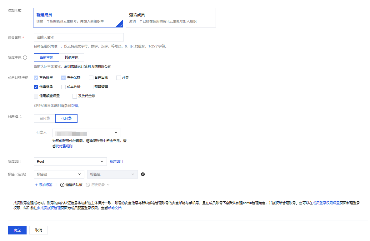 新建成员:新建成员时,成员账号默认和管理员账号使用同一个企业实名认证名称,在“付费模式”中勾选“自付费”后,可以再次勾选“优惠继承”,创建成员即可。如下图所示: