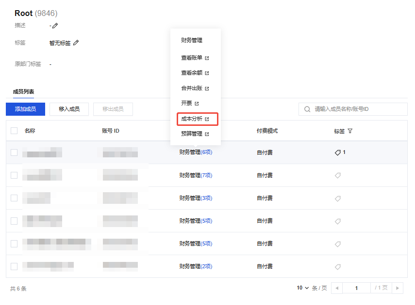 4. 已添加的成员,可在 成员账号管理 页面,找到成员账号,单击操作栏的编辑。 5. 在编辑成员页面,勾选成本分析后,单击确定。更多介绍请参见 成本分析。 查看成本分析