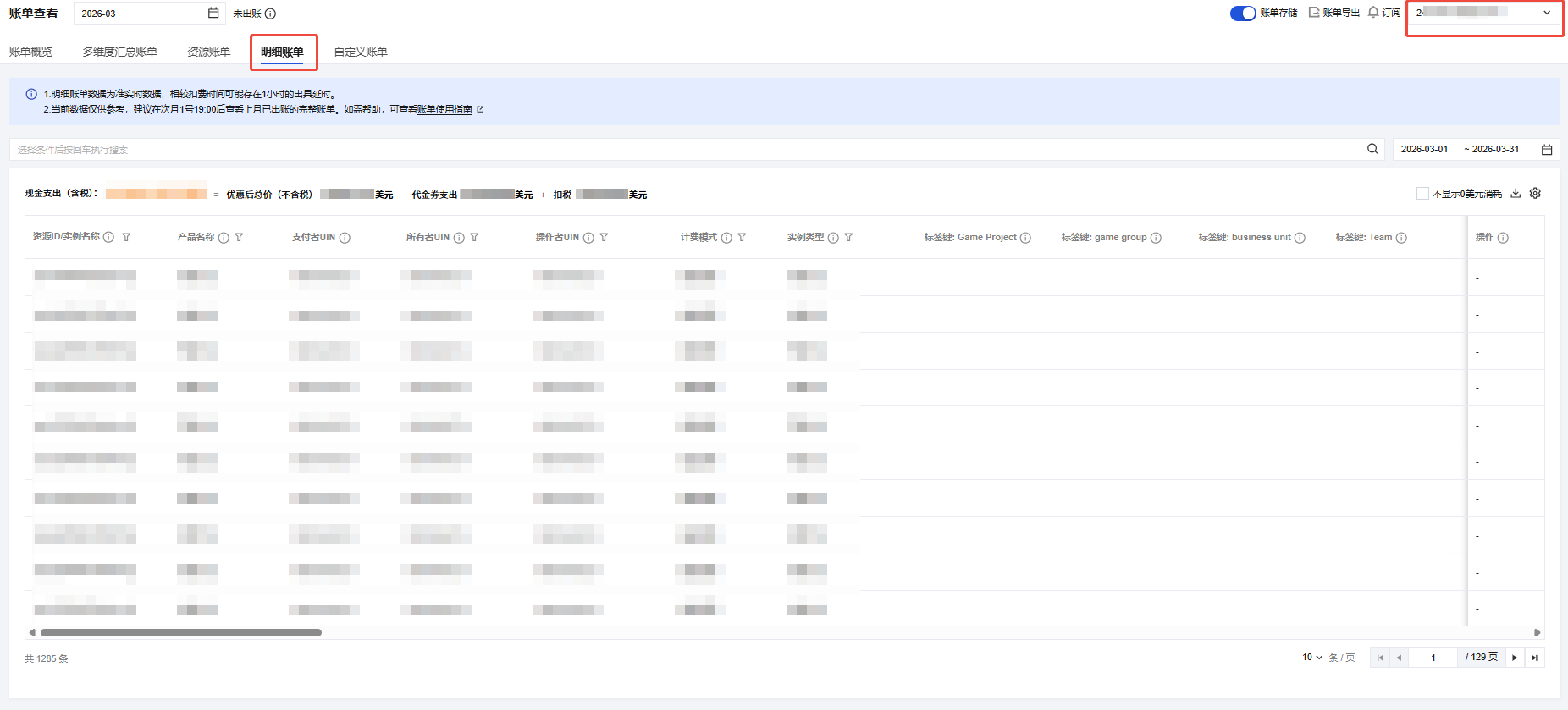 3. 在明细账单页签,通过右上方的下拉列表,选择对应的成员账号,查看成员账号的账单详情。