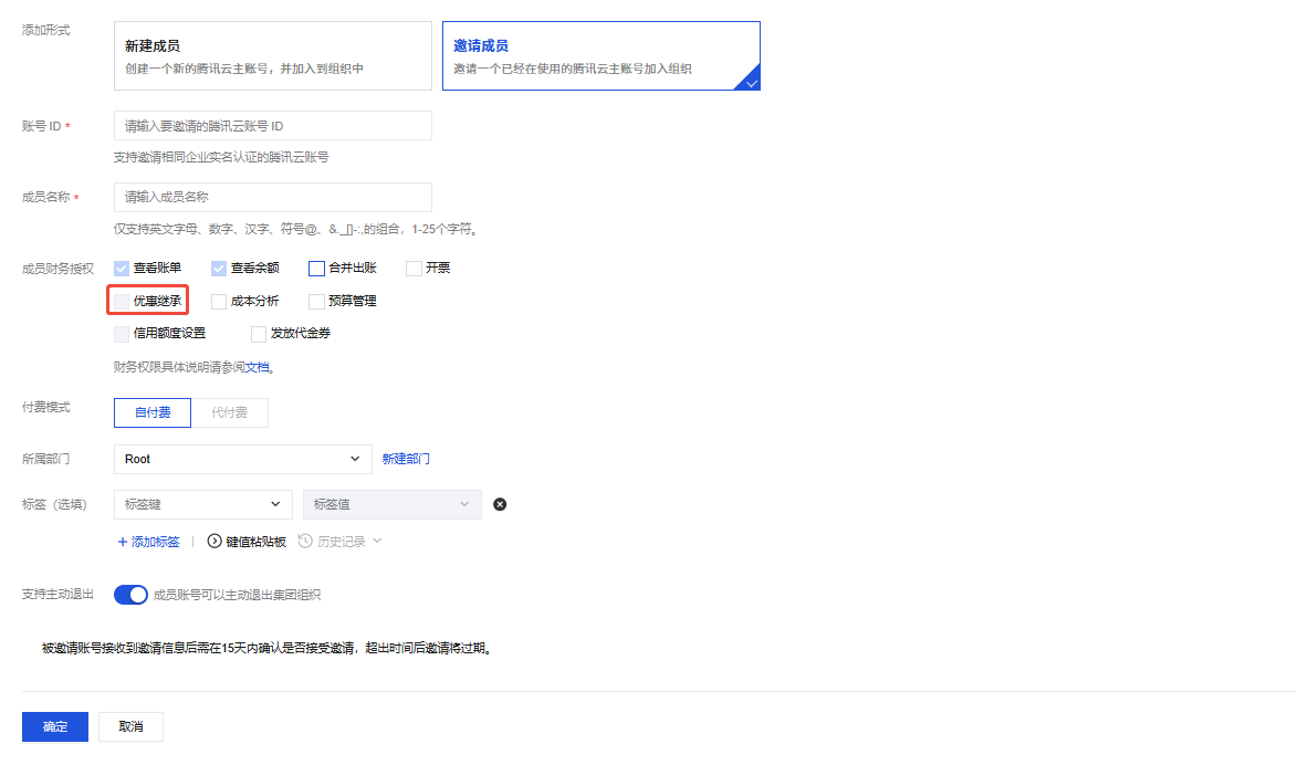 若成员账号和管理员账号使用同一个企业认证主体,在“付费模式”中勾选“自付费”后,可以再次勾选“优惠继承”,邀请成员即可。如下图所示: