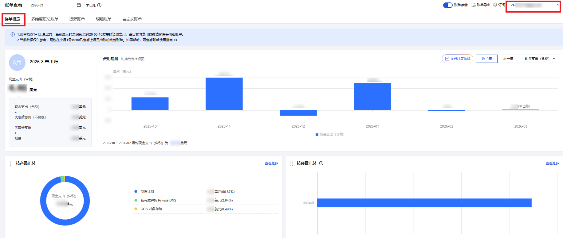 2. 在账单概览页面,通过右上方的下拉列表,选择对应的成员账号,查看成员账号的账单概览。