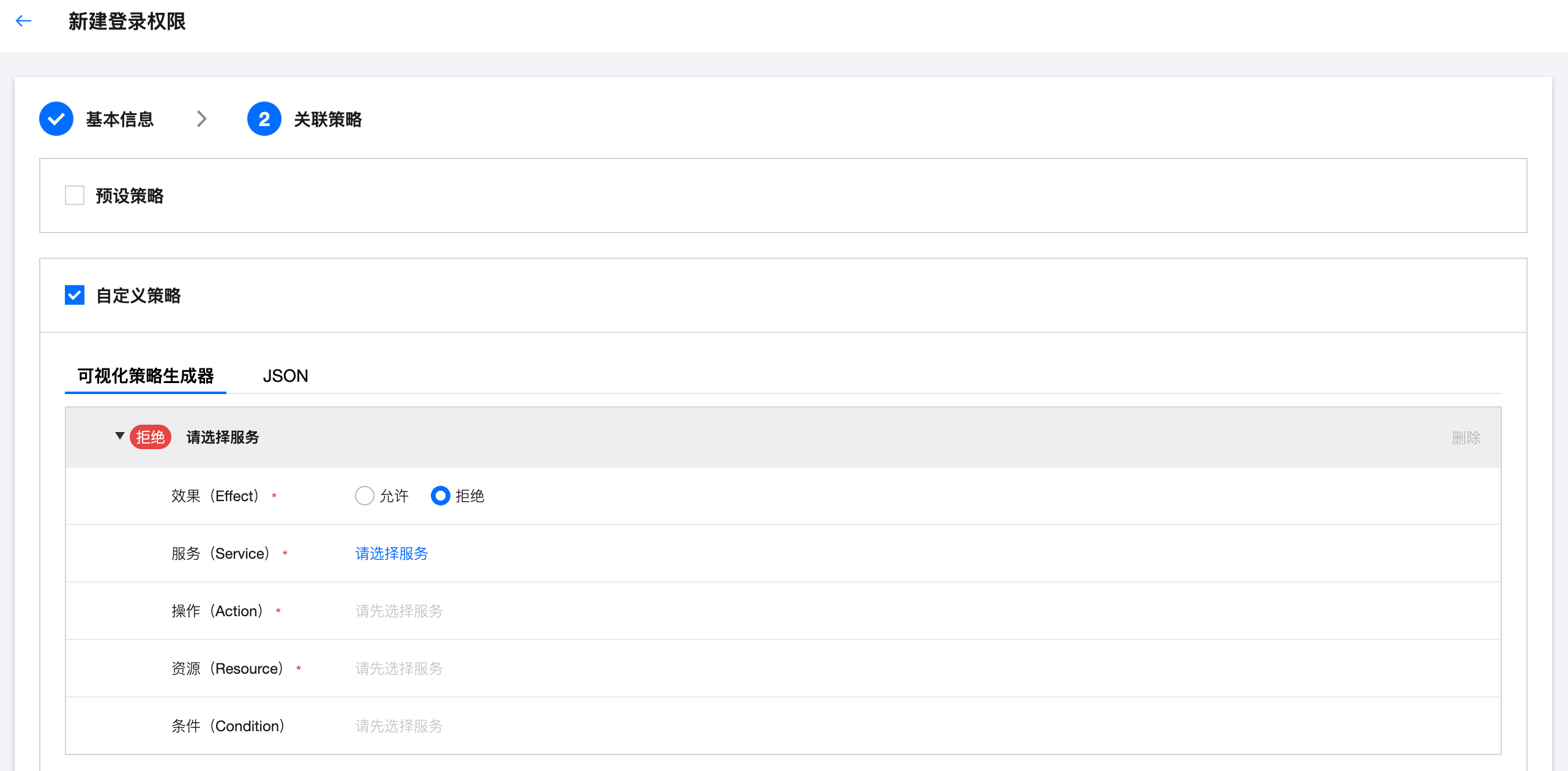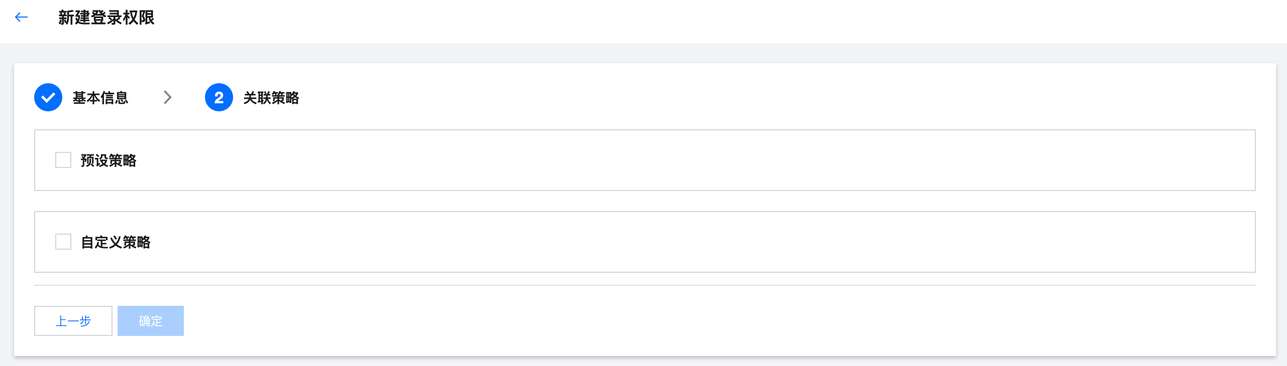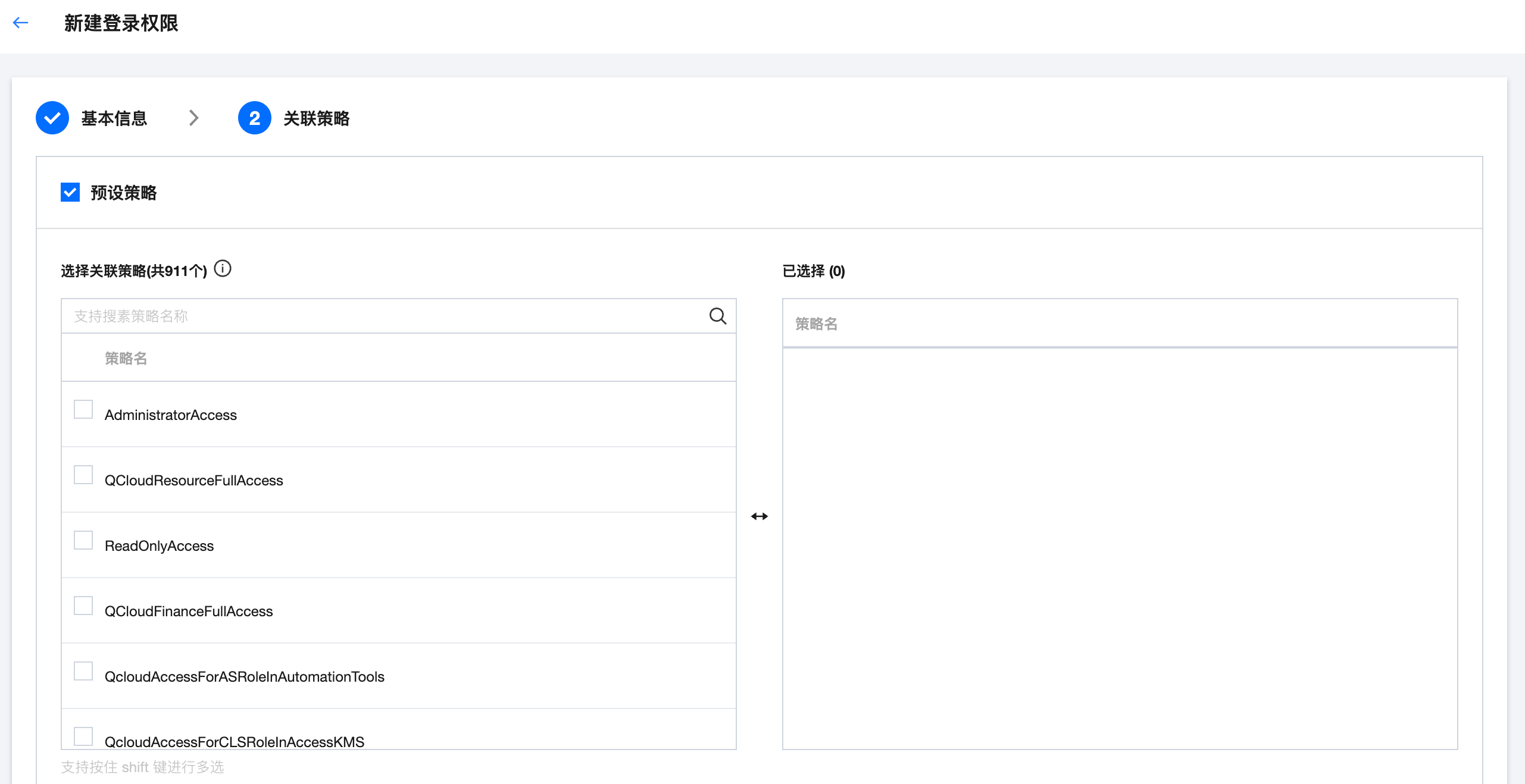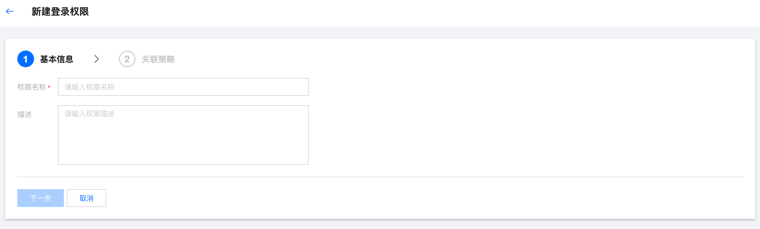 3.1 填写登录权限基本信息,包含权限名称和描述,其中权限名称为必填,描述为选填,输入基本信息后单击下一步。 3.2 选择登录权限关联的策略,可以根据需求选择预设策略或自定义策略(可同时选择)。