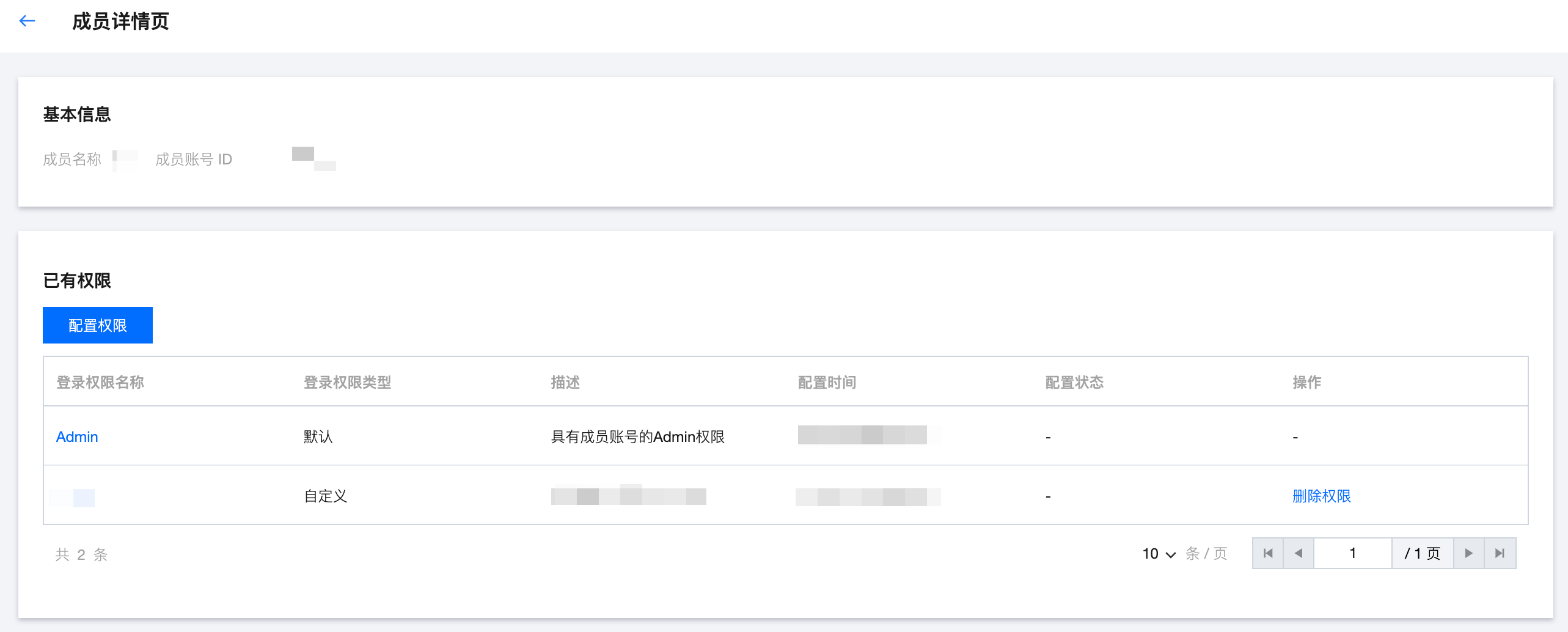 3. 在成员详情页中,选择需要删除的权限,并单击操作列的删除权限,如下图所示: