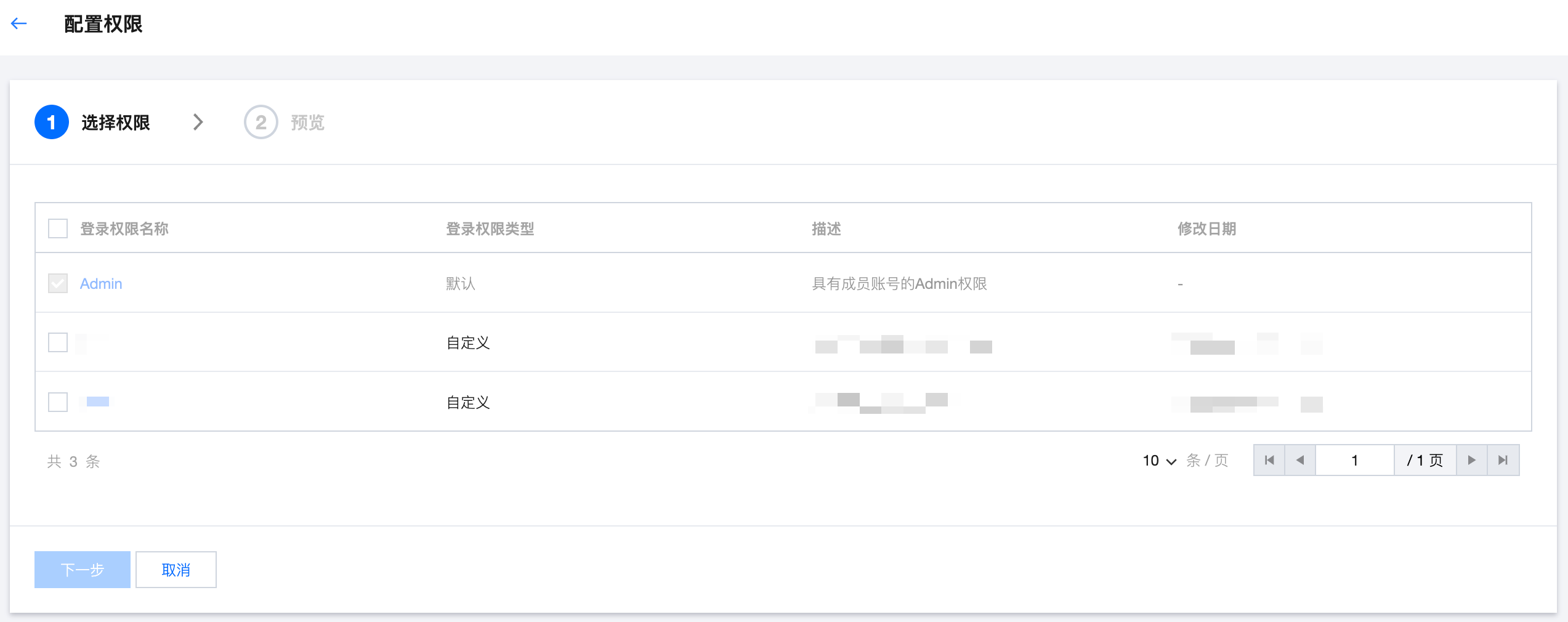 配置权限时,可选择的权限列表包含全部默认的登录权限和自定义创建的登录权限。