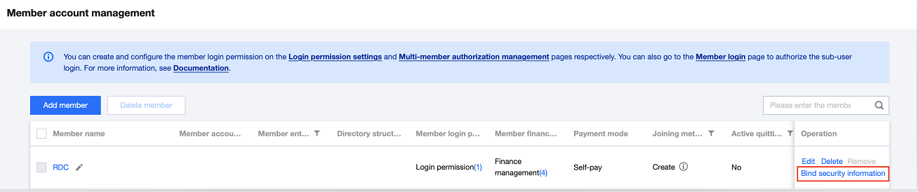1. 登录集团账号管理控制台,选择左侧导航栏中的 成员账号管理。 2. 在“成员账号管理”页面中,单击成员所在行右侧的绑定安全信息。如下图所示: