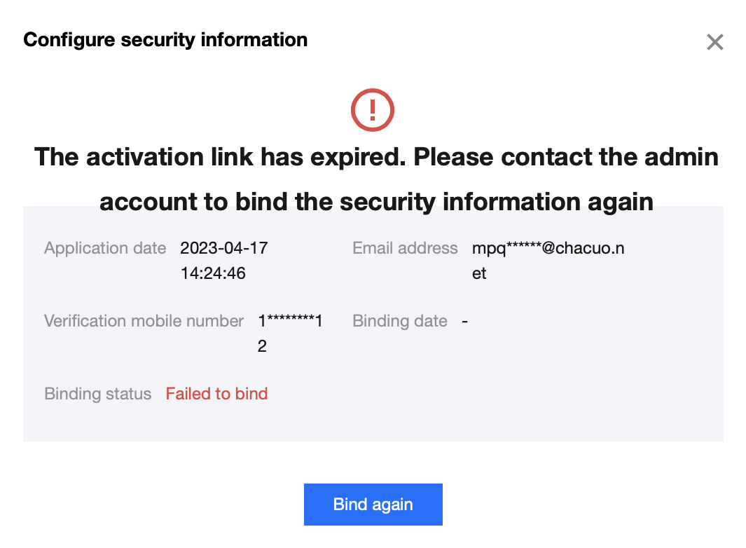若您未在规定期限内单击激活链接,则绑定信息将激活失败。请通过控制台重新提交绑定信息,且需使用其他邮箱,激活失败的邮箱将不能再次绑定。