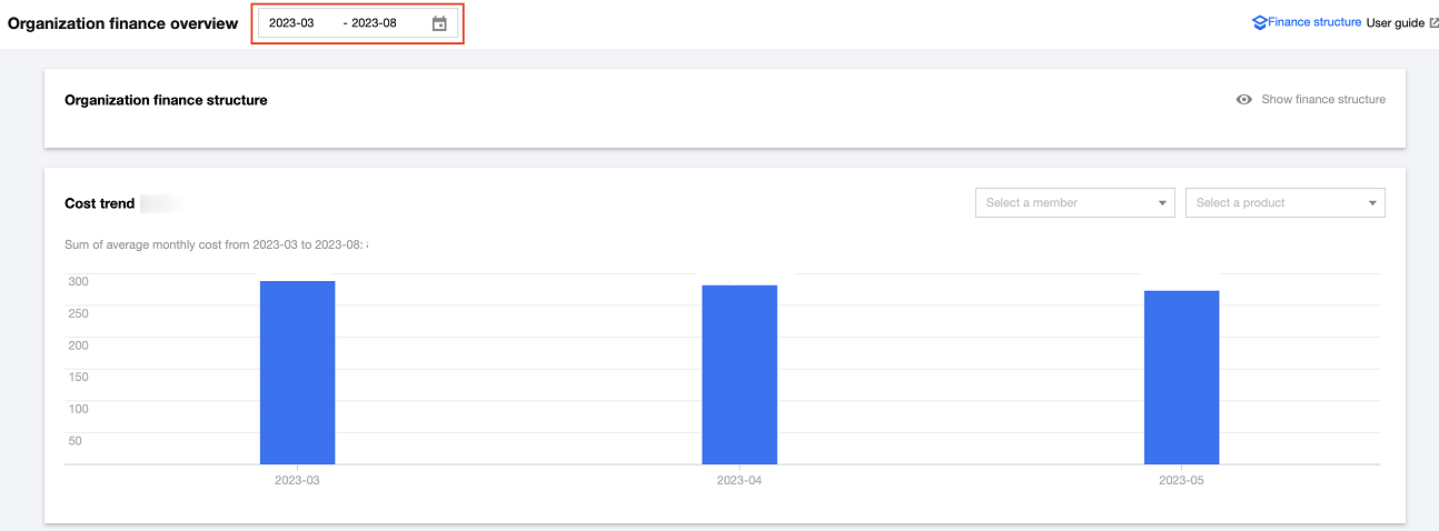 2. 在集团财务概览页面最上方选择相应的时间,在费用趋势模块选择成员以及产品,则会对应显示出费用趋势和账单详情。