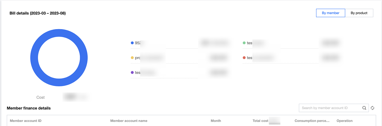 在下方展示所选成员的财务列表,包含成员账号 ID、成员账号名称、时间、总费用、消费占比、详情。单击消费详情则会显示某成员在所选时间内的产品消耗分布图。