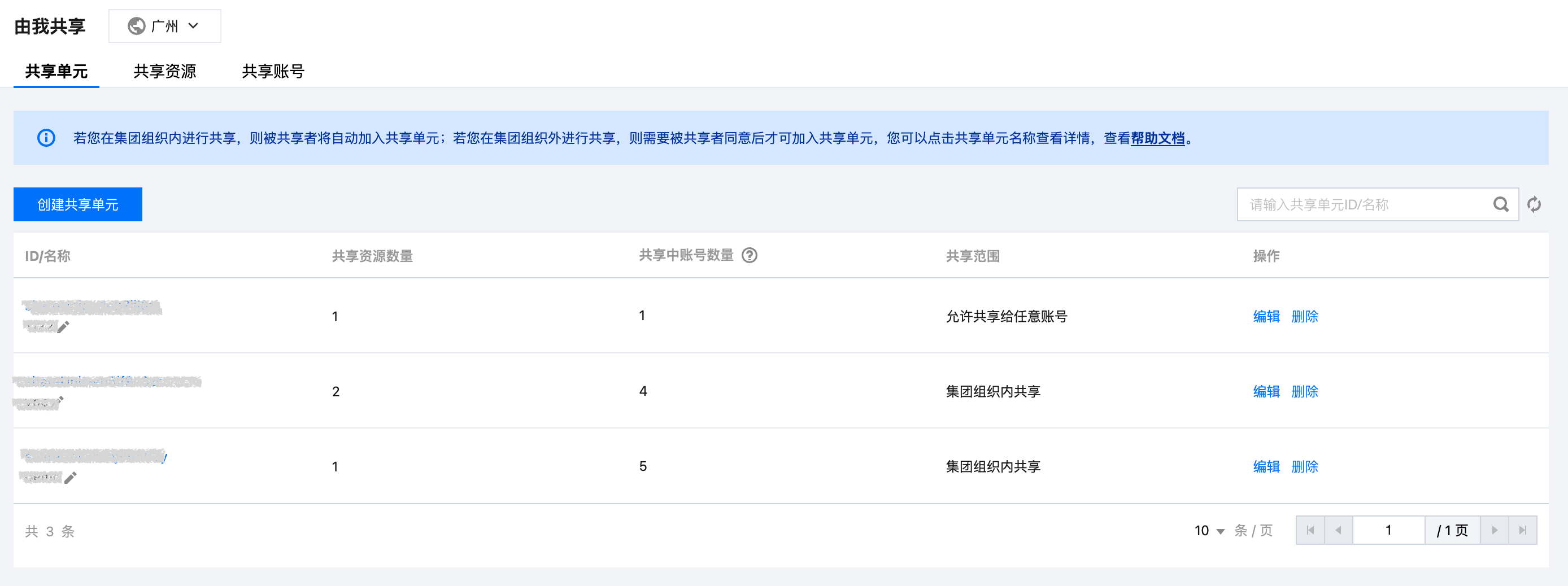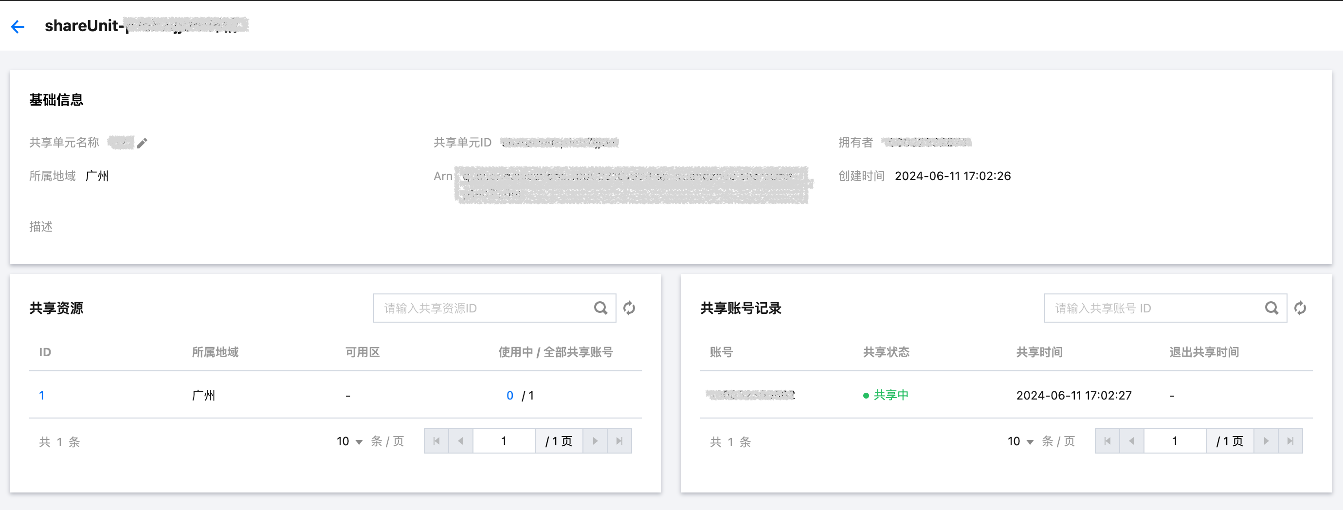 单击共享单元名称,可以进入共享单元详情页面查看已共享的资源及对应成员账号。