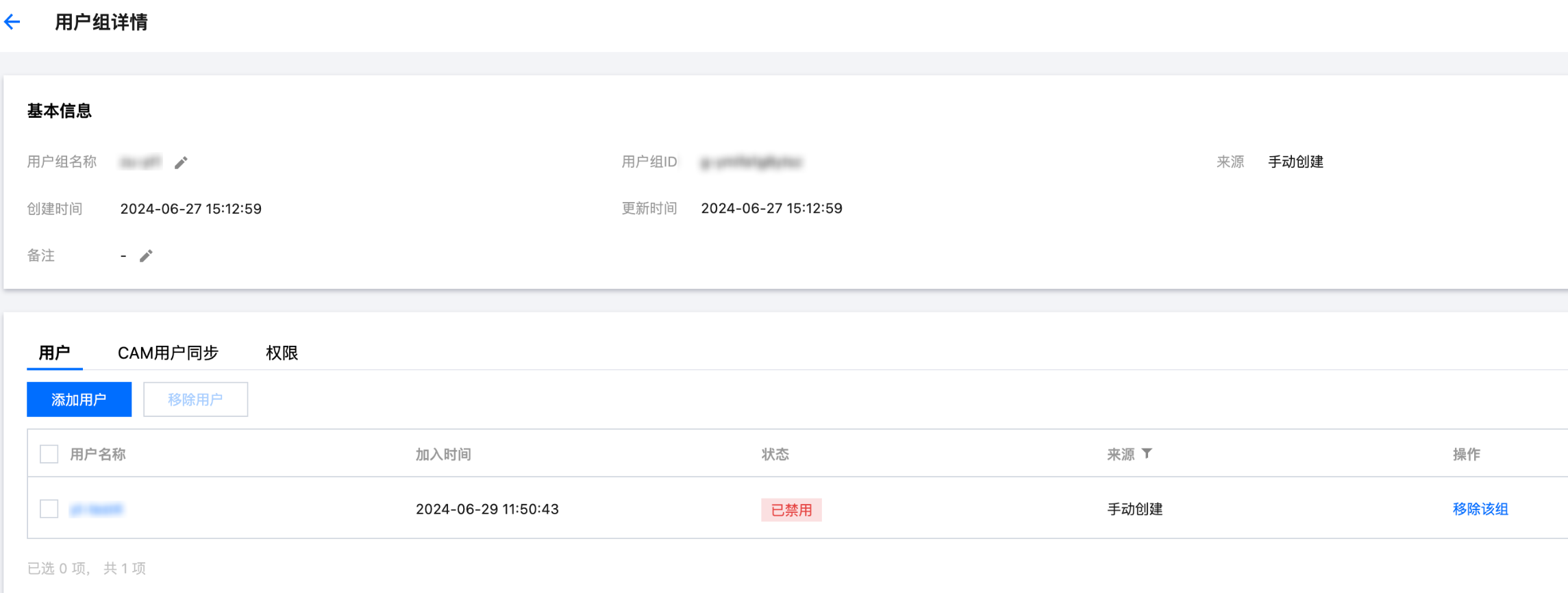 2. 在用户组详情页顶部基本信息区域,可修改的字段为:用户组名称和备注。