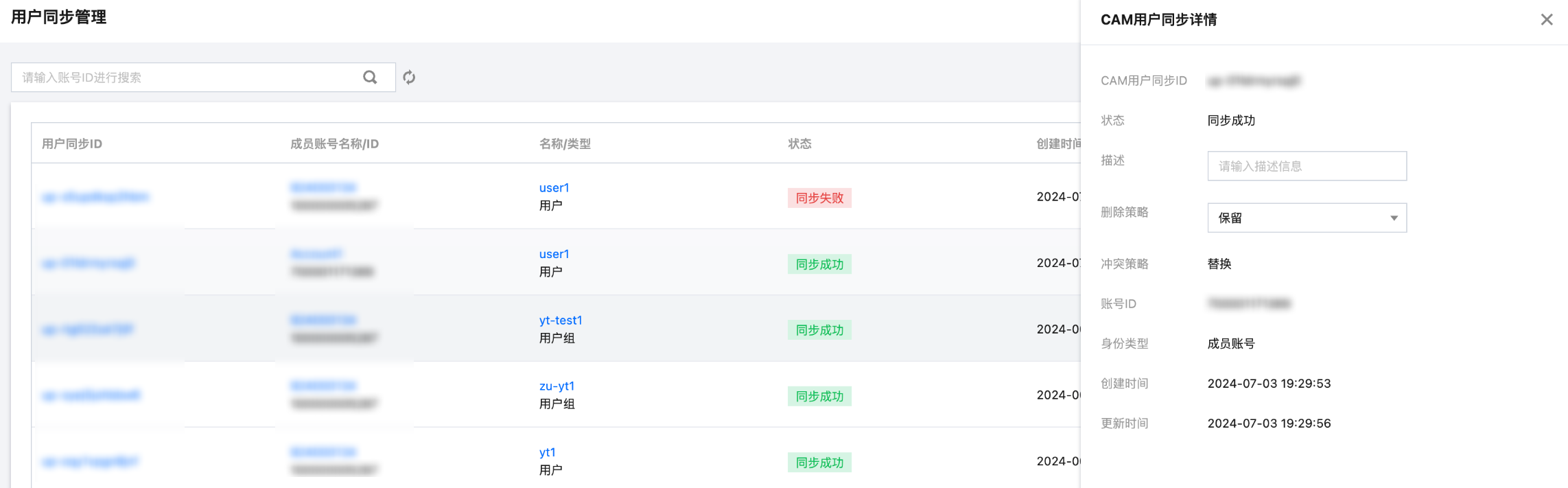 4. 在用户同步详情面板,查看用户同步详情。包括 CAM 用户同步 ID、状态、删除策略、冲突策略、创建时间等。