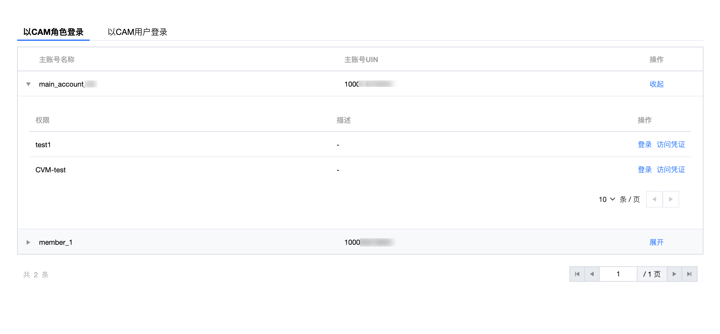 在身份中心中通过权限配置设置了访问权限,就可以通过 CAM 角色访问账号资源。该方式适用于大部分的云服务。配置方法,请参见 配置 CAM 角色同步。 1. 在以 CAM 角色登录页签,单击目标账号操作列的展开。