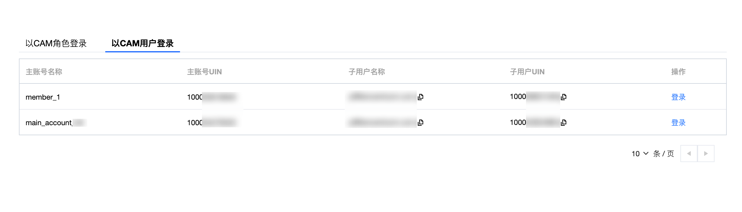 对于不支持 CAM 角色的云服务,且在身份中心中配置了 CAM 用户同步,就可以通过 CAM 用户访问账号资源。配置方法,请参见 配置 CAM 用户同步。 在以 CAM 用户登录页签,单击目标账号操作列的登录。