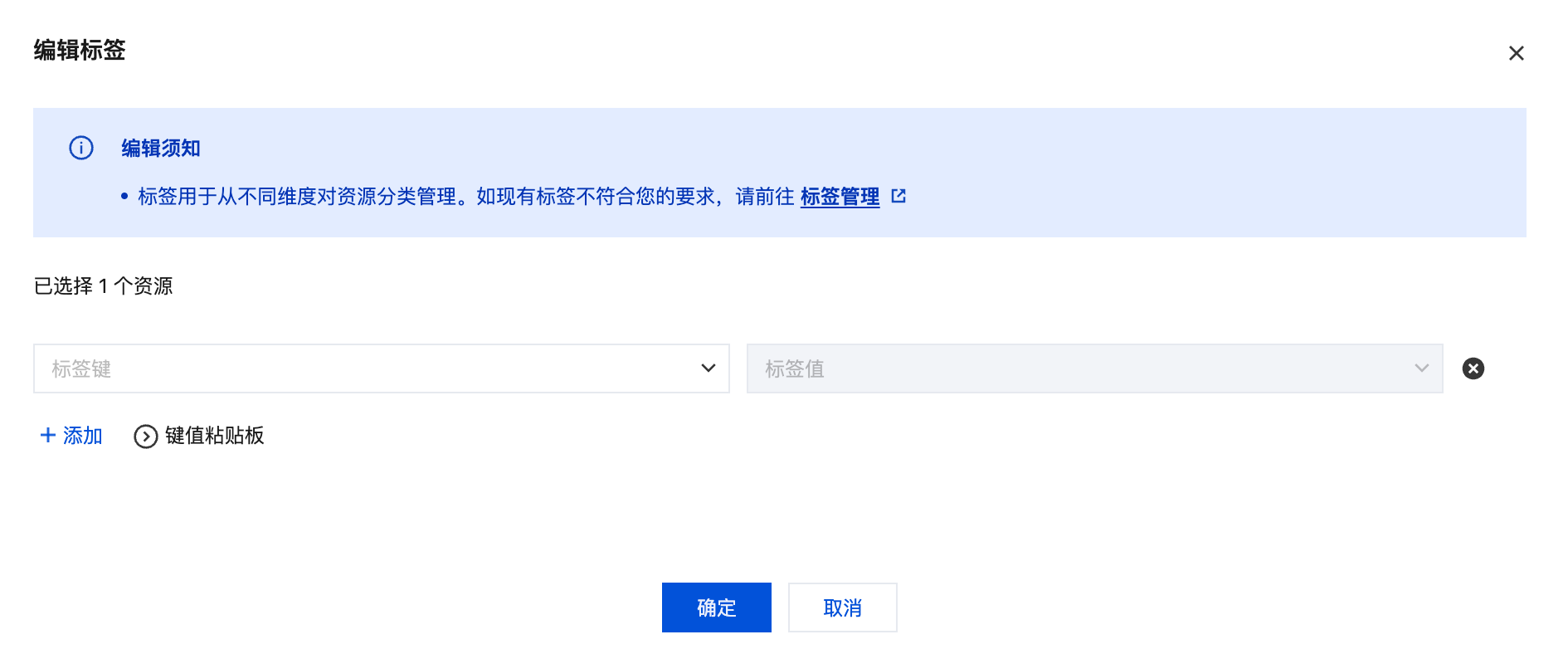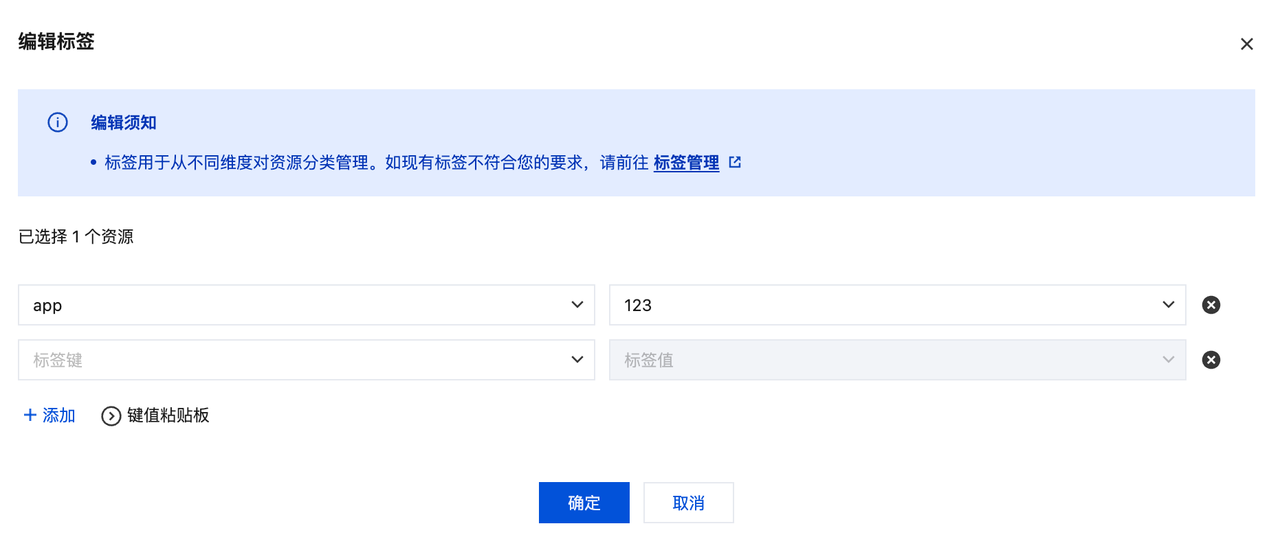 4. 在编辑标签的位置,在下拉列表里选择标签键值。若当前已有标签键值无法满足需求,请前往 标签控制台 创建新标签,详情请参见创建标签并绑定资源。 说明: