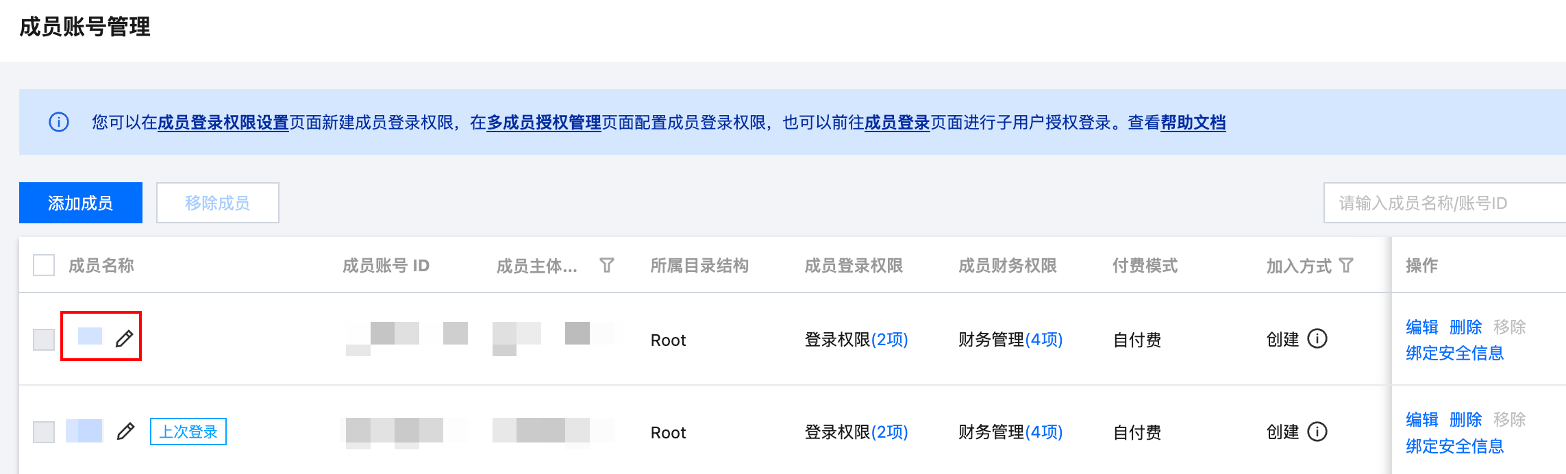 或者单击成员账号管理,进入成员账号管理页面。