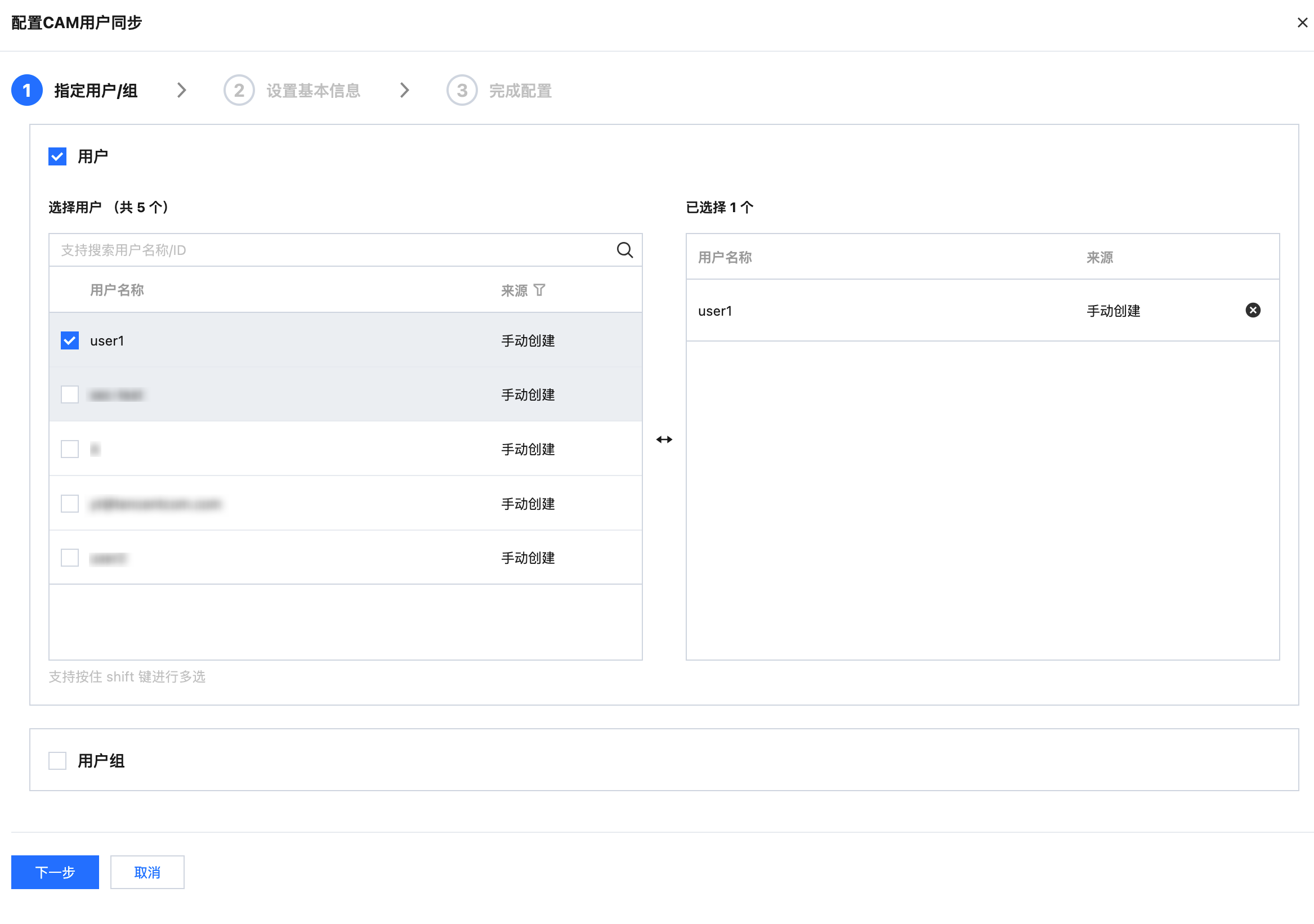 4. 在配置 CAM 用户同步面板,选择目标用户或用户组,单击下一步。