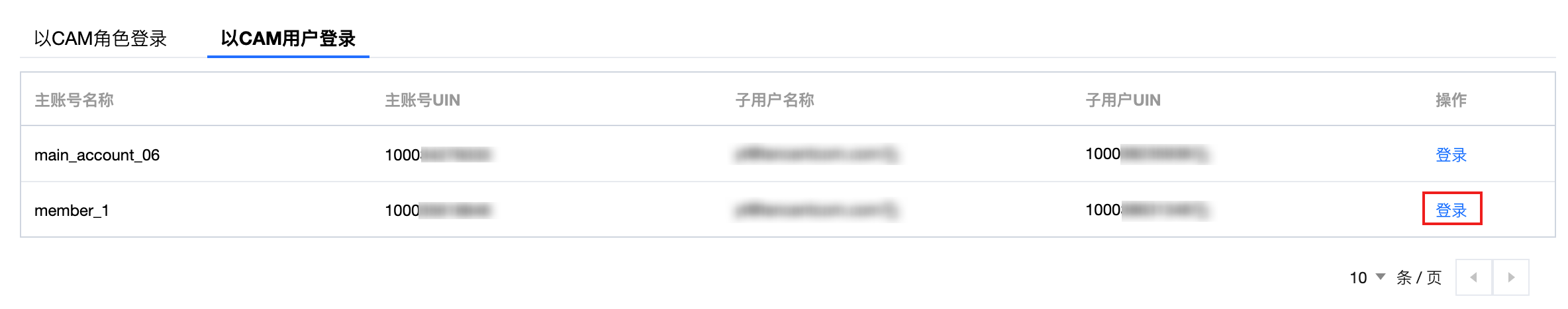 3. 验证通过后,进入以 CAM 用户登录页签,选择成员账号(member_1)登录。
