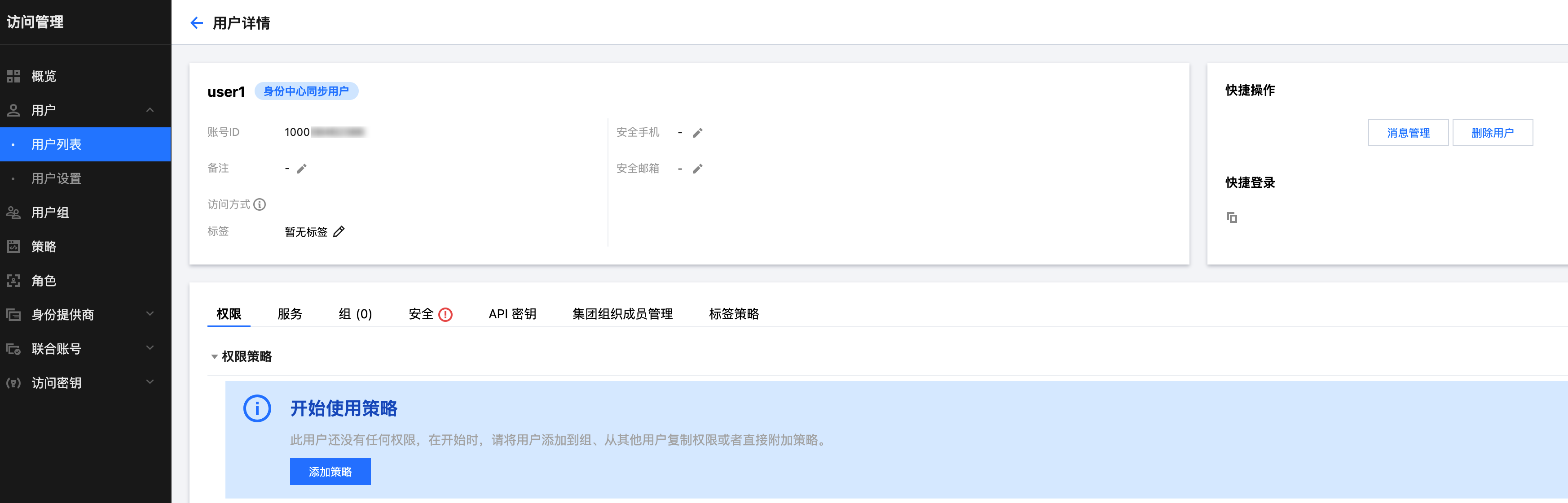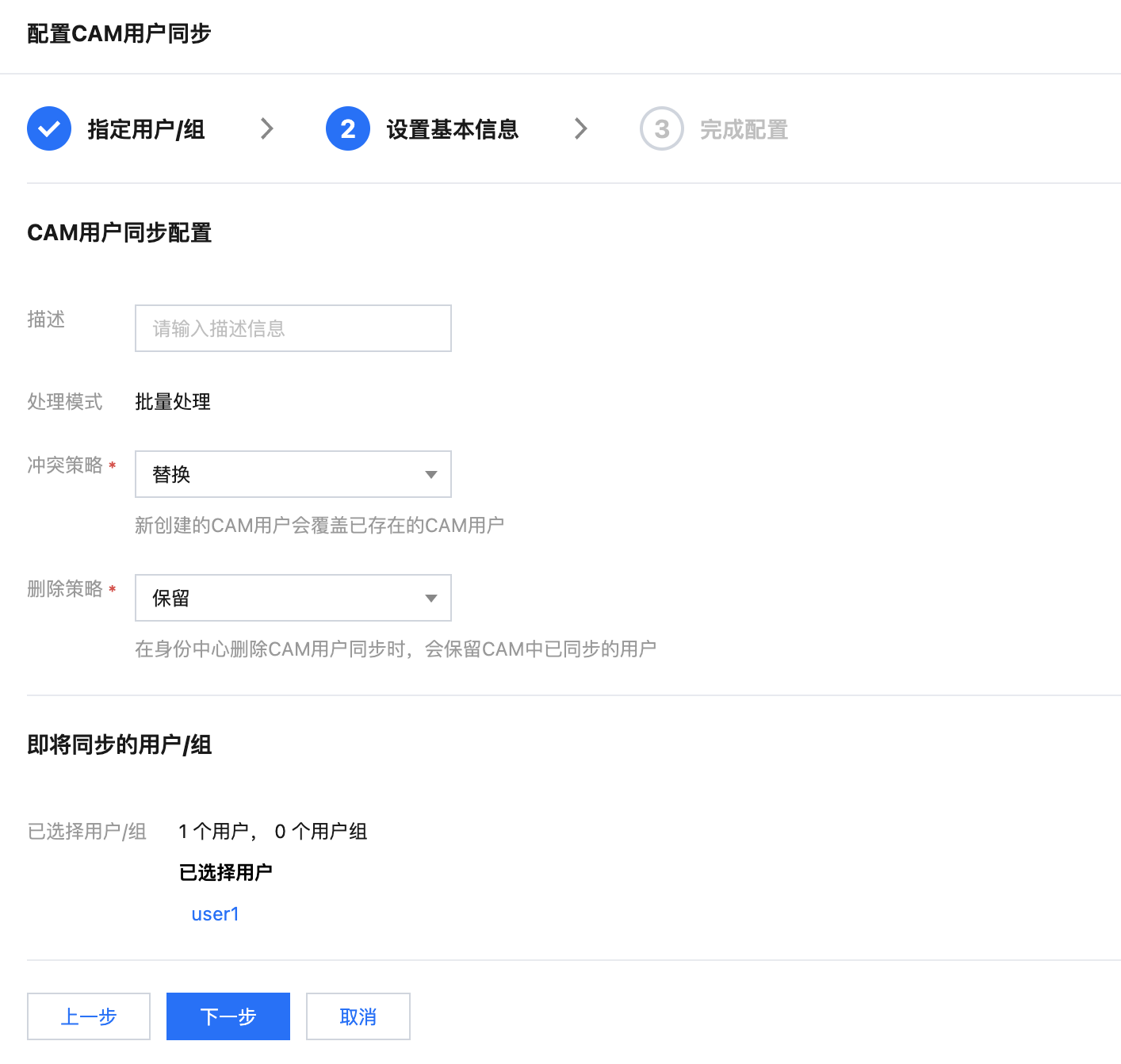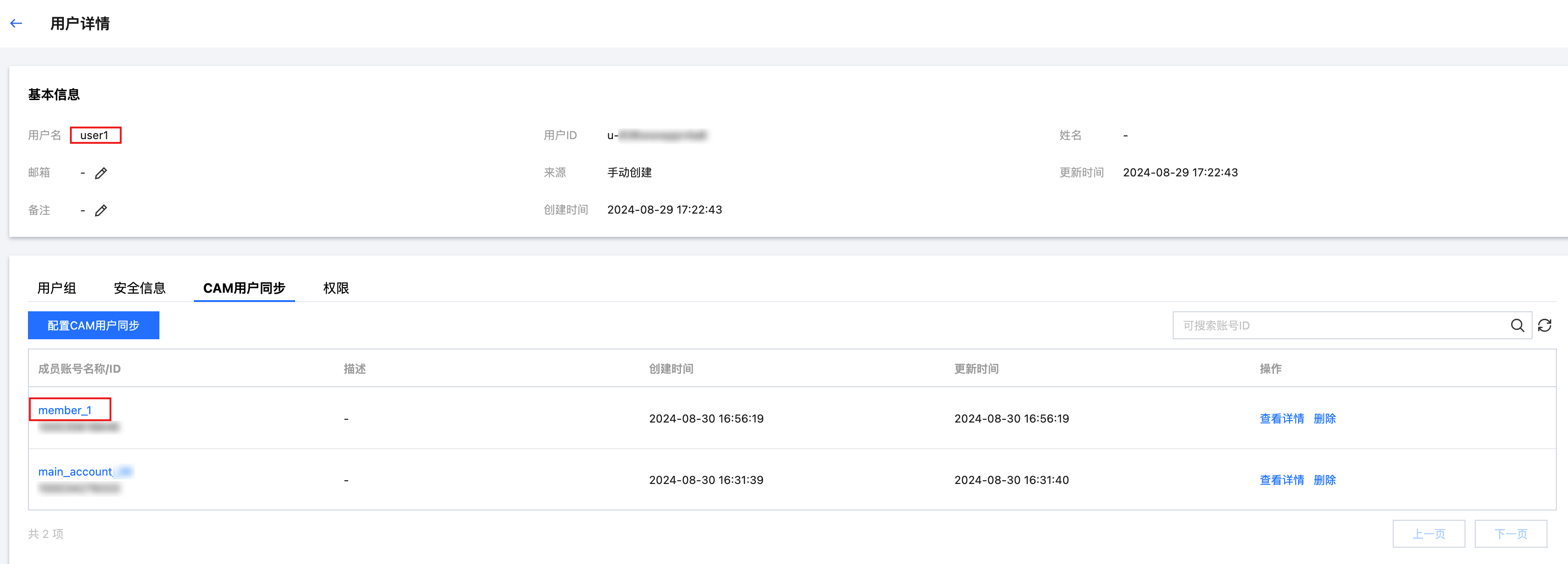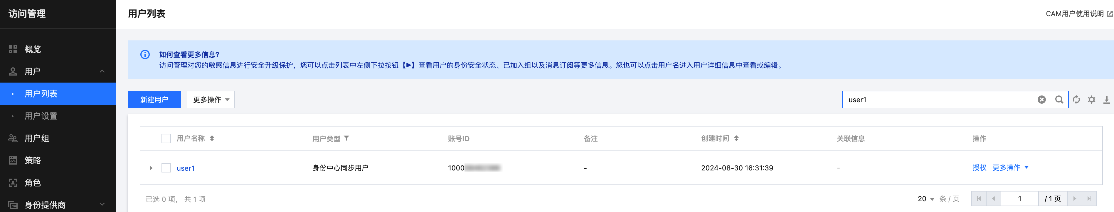 或在用户管理 > 用户,user1 的用户详情页的 CAM 用户同步页签中查看。