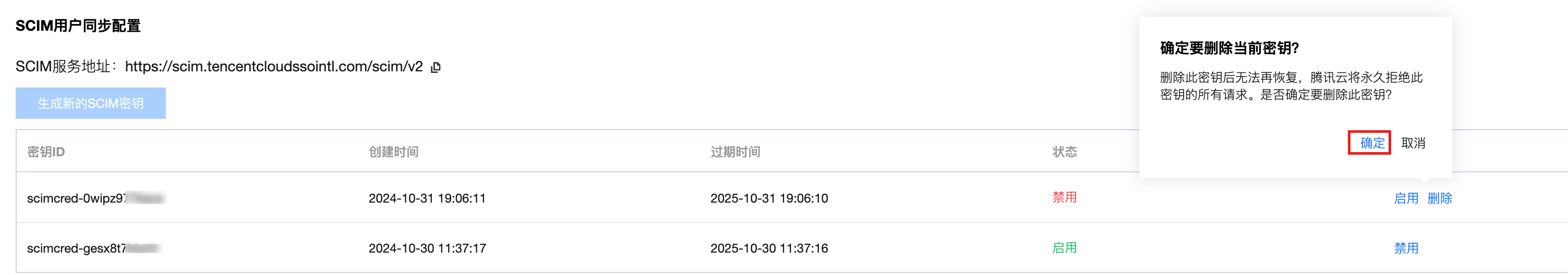 3. 在 SCIM 用户同步配置区域,单击目标 SCIM 密钥的删除。 4. 在删除 SCIM 密钥对话框,单击确定。
