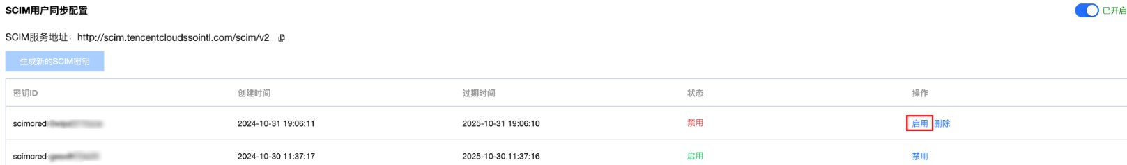 新创建的 SCIM 密钥,默认处于启用状态。